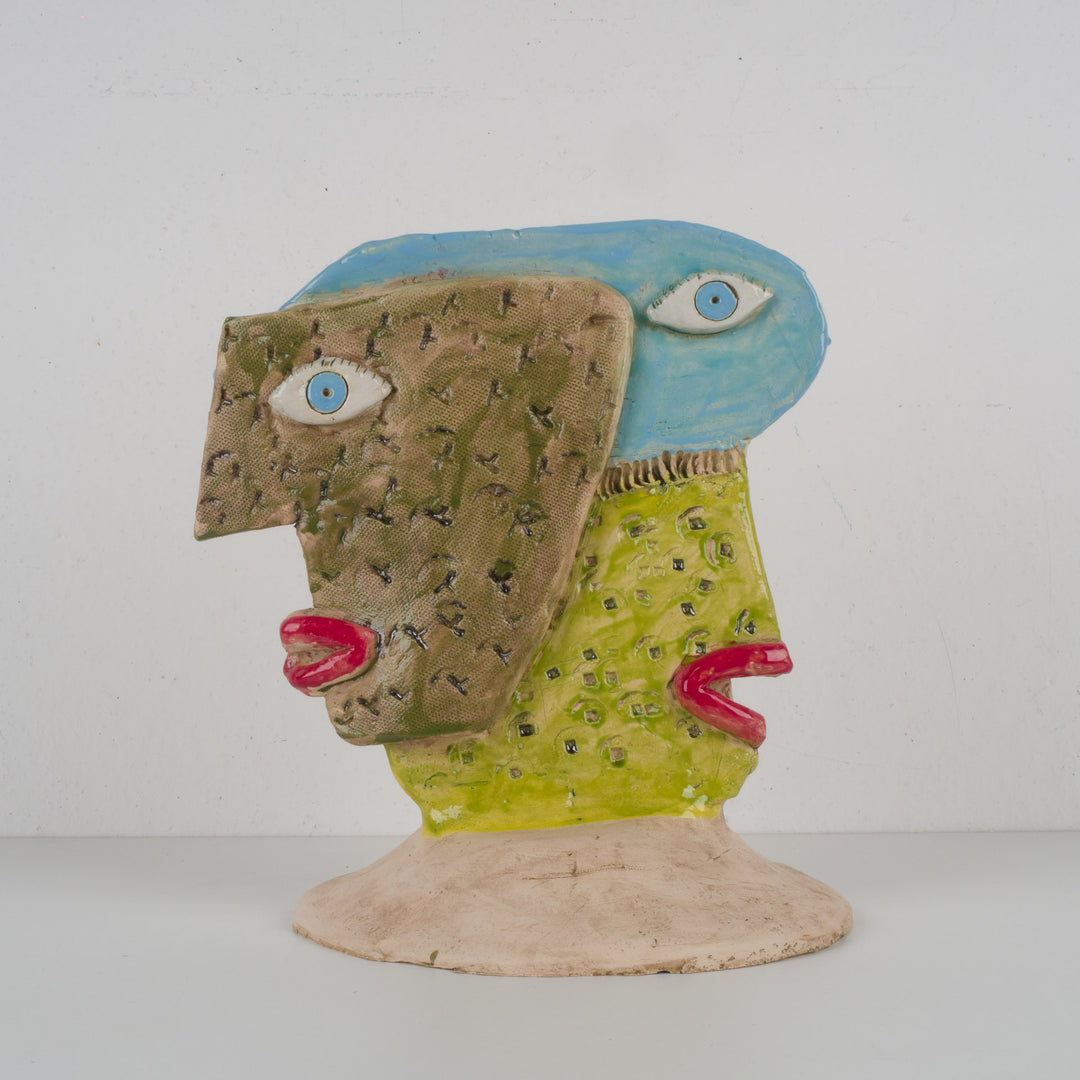 Ludiek geometrisch keramisch beeld – Gezichten in lichtblauw en groentinten
