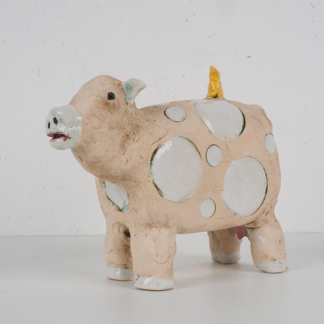 Handgemaakt ludiek keramieken beeldje – Koe met geel vogeltje