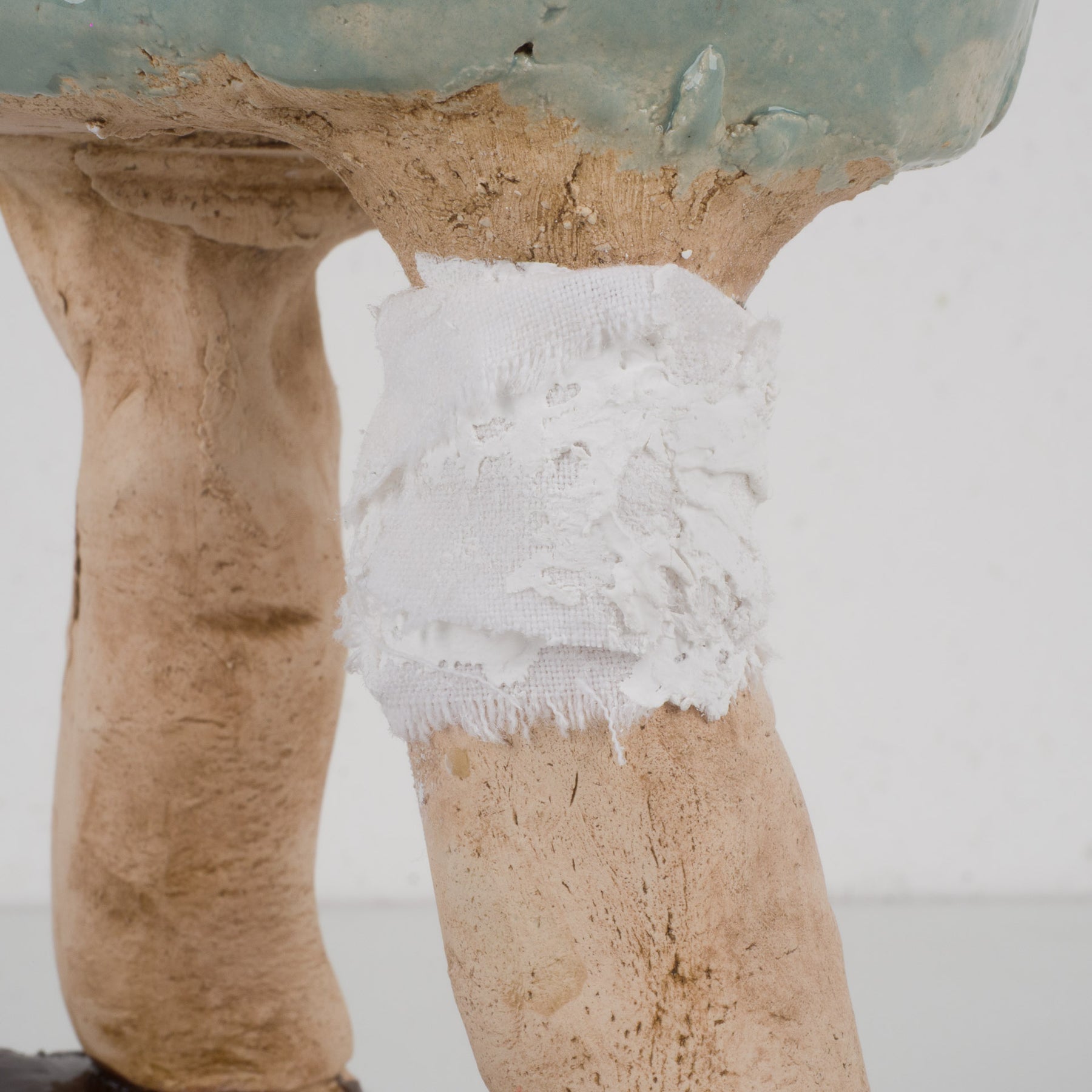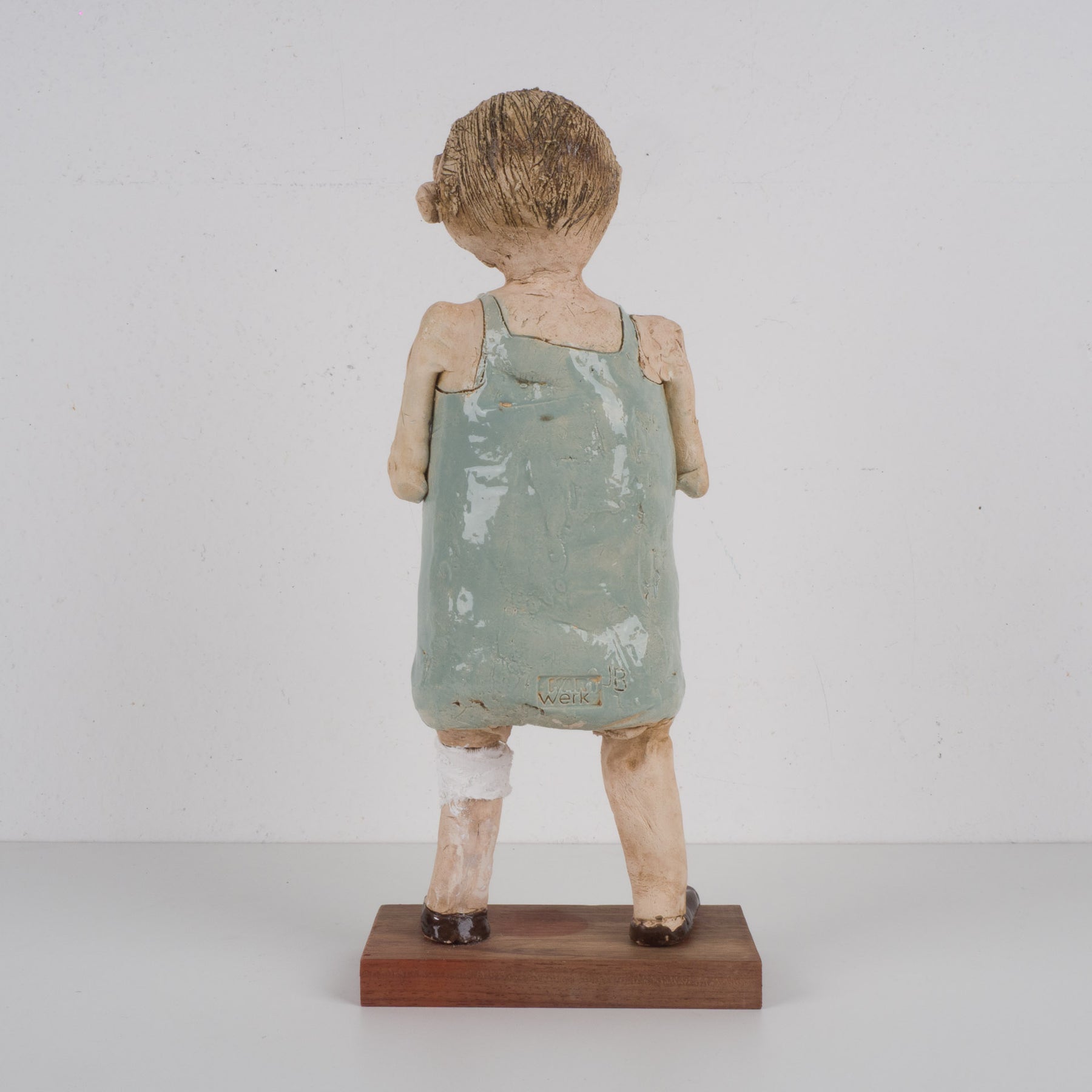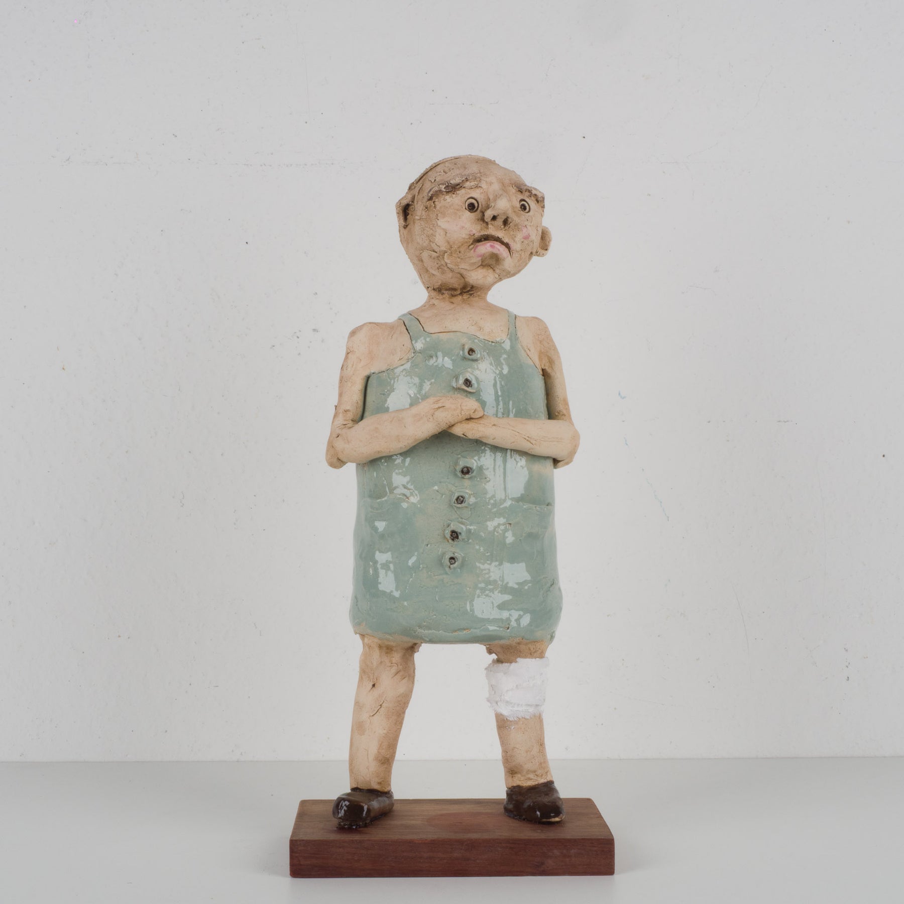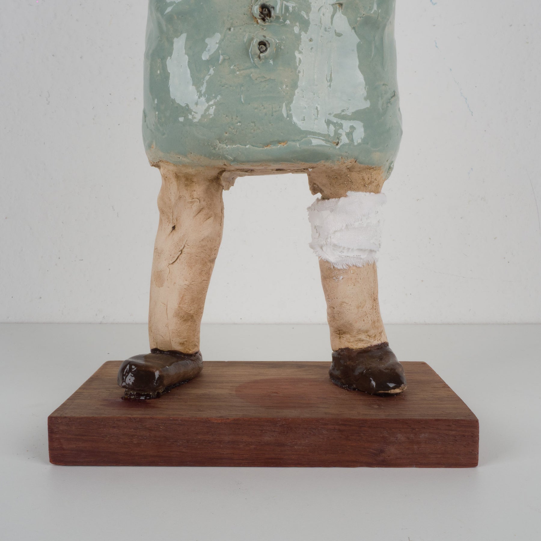 Dit bijzonder expressieve en handgemaakte beeld toont een zieke man met verband rond zijn benen, vormgegeven in zacht lichtblauw geglazuurde keramiek. Het staat stevig en stijlvol op een houten sokkeltje en meet in totaal 18,5x10x42,5 cm. Het geheel straalt kwetsbaarheid, menselijkheid en ambacht uit, met oog voor detail in de houding en lichaamstaal.