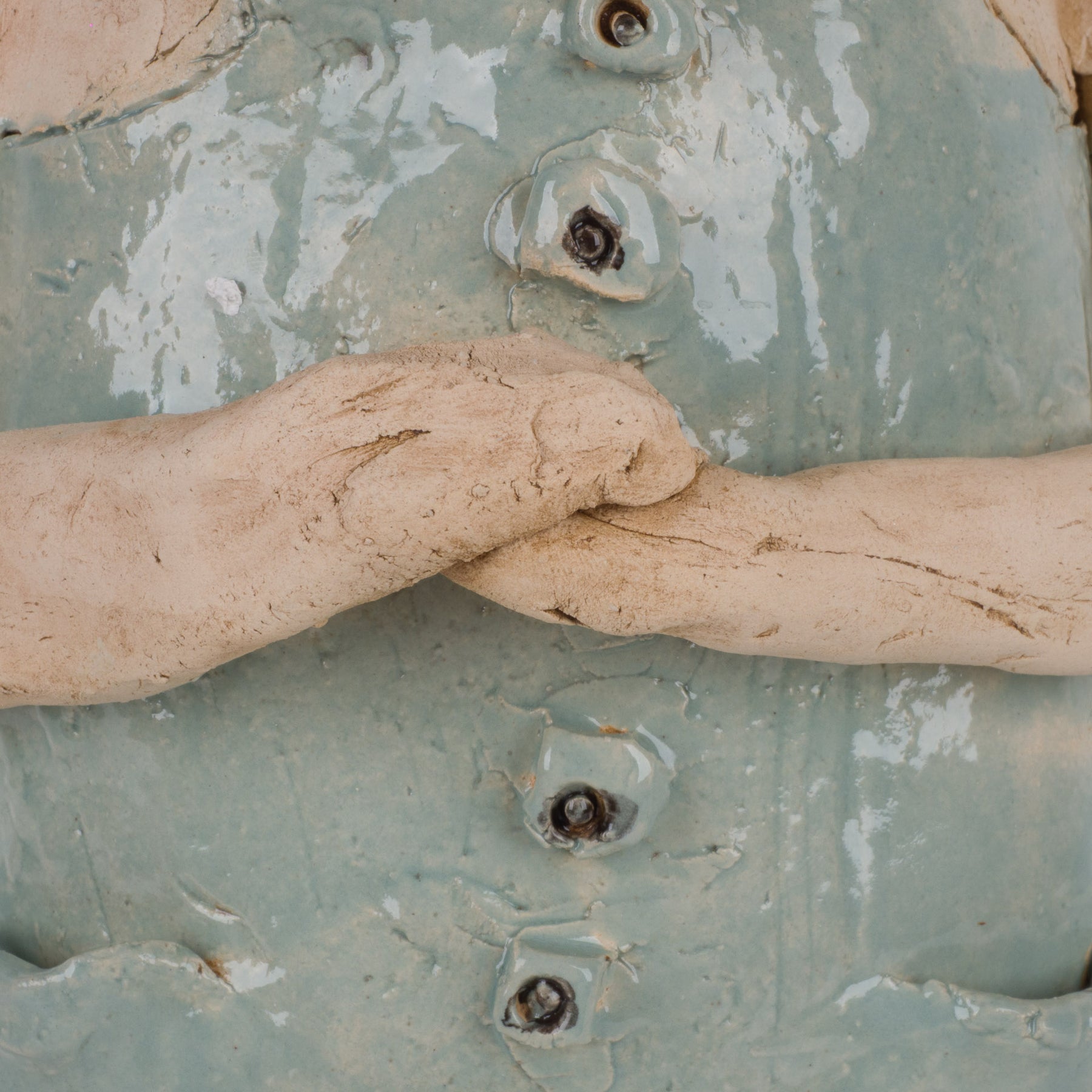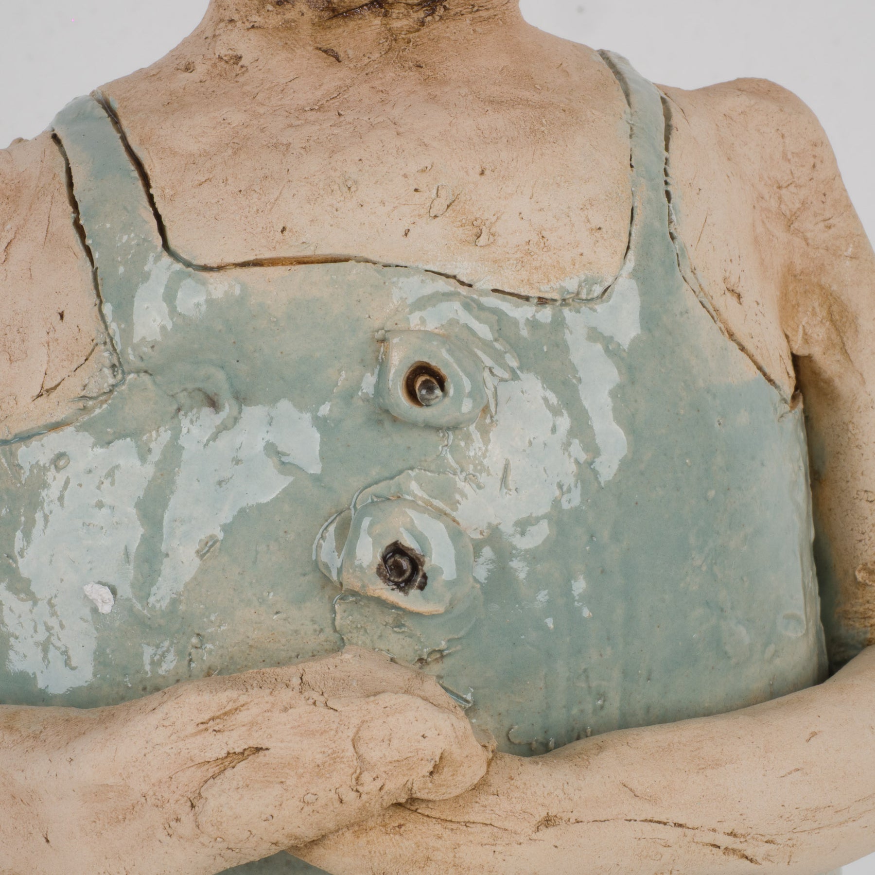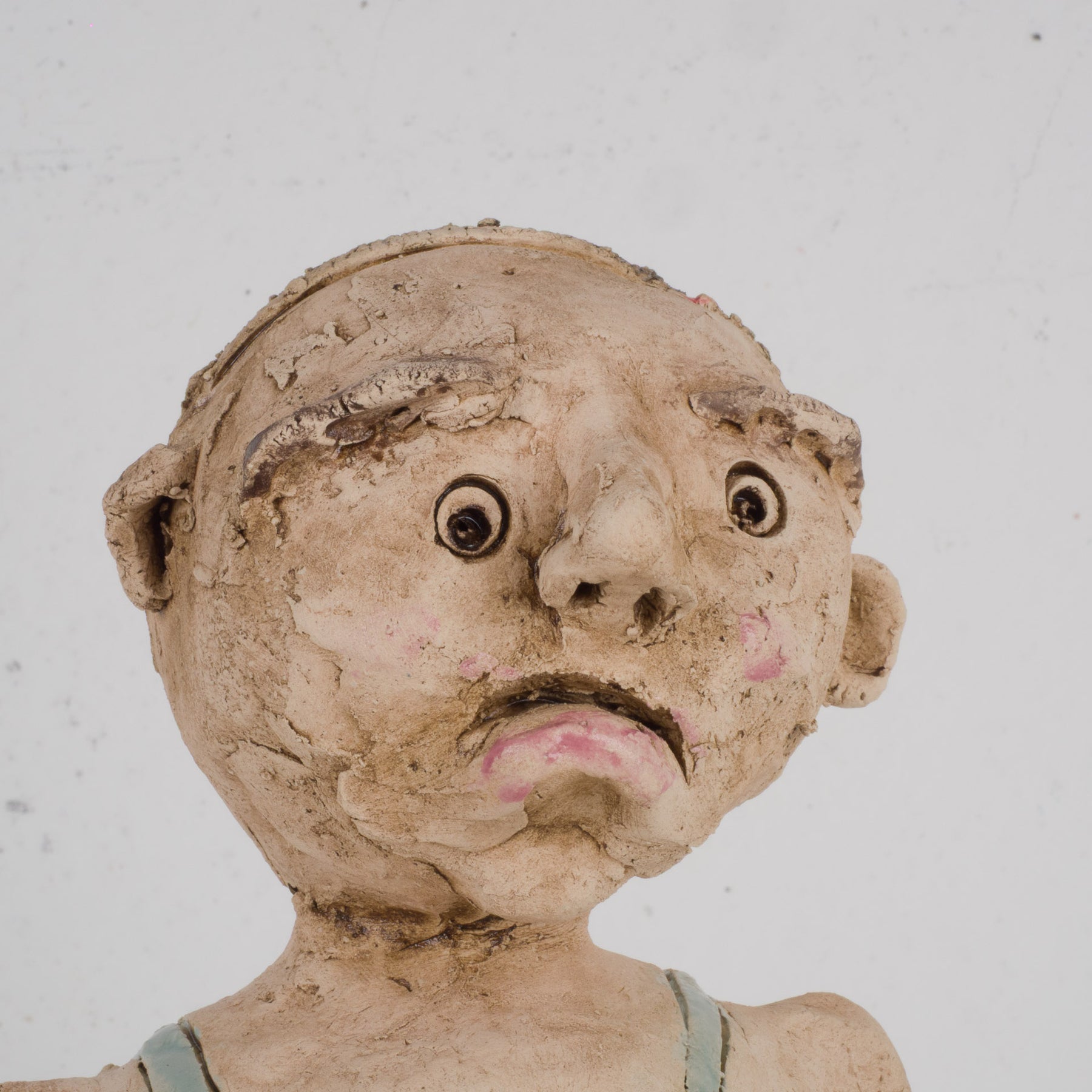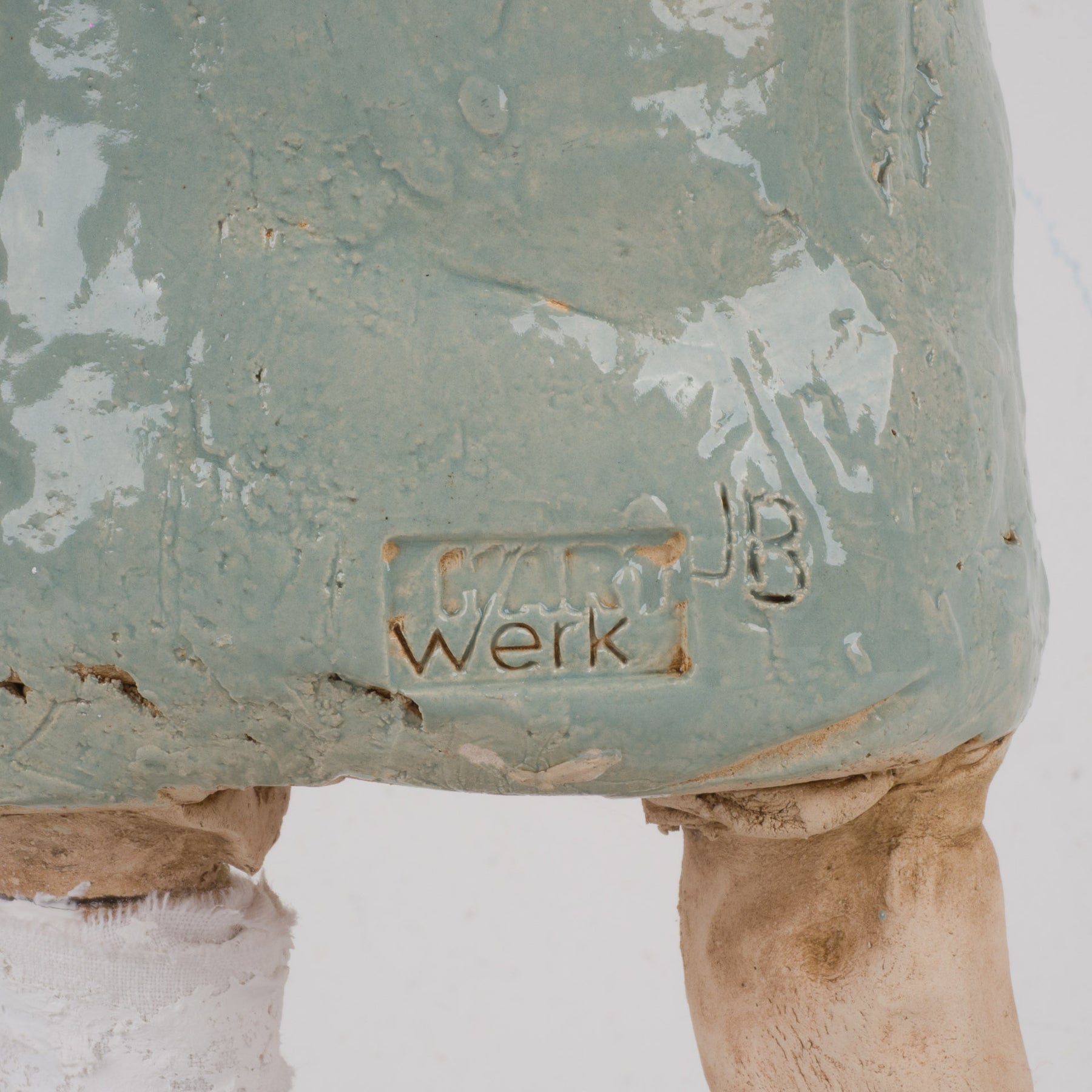 Dit bijzonder expressieve en handgemaakte beeld toont een zieke man met verband rond zijn benen, vormgegeven in zacht lichtblauw geglazuurde keramiek. Het staat stevig en stijlvol op een houten sokkeltje en meet in totaal 18,5x10x42,5 cm. Het geheel straalt kwetsbaarheid, menselijkheid en ambacht uit, met oog voor detail in de houding en lichaamstaal.