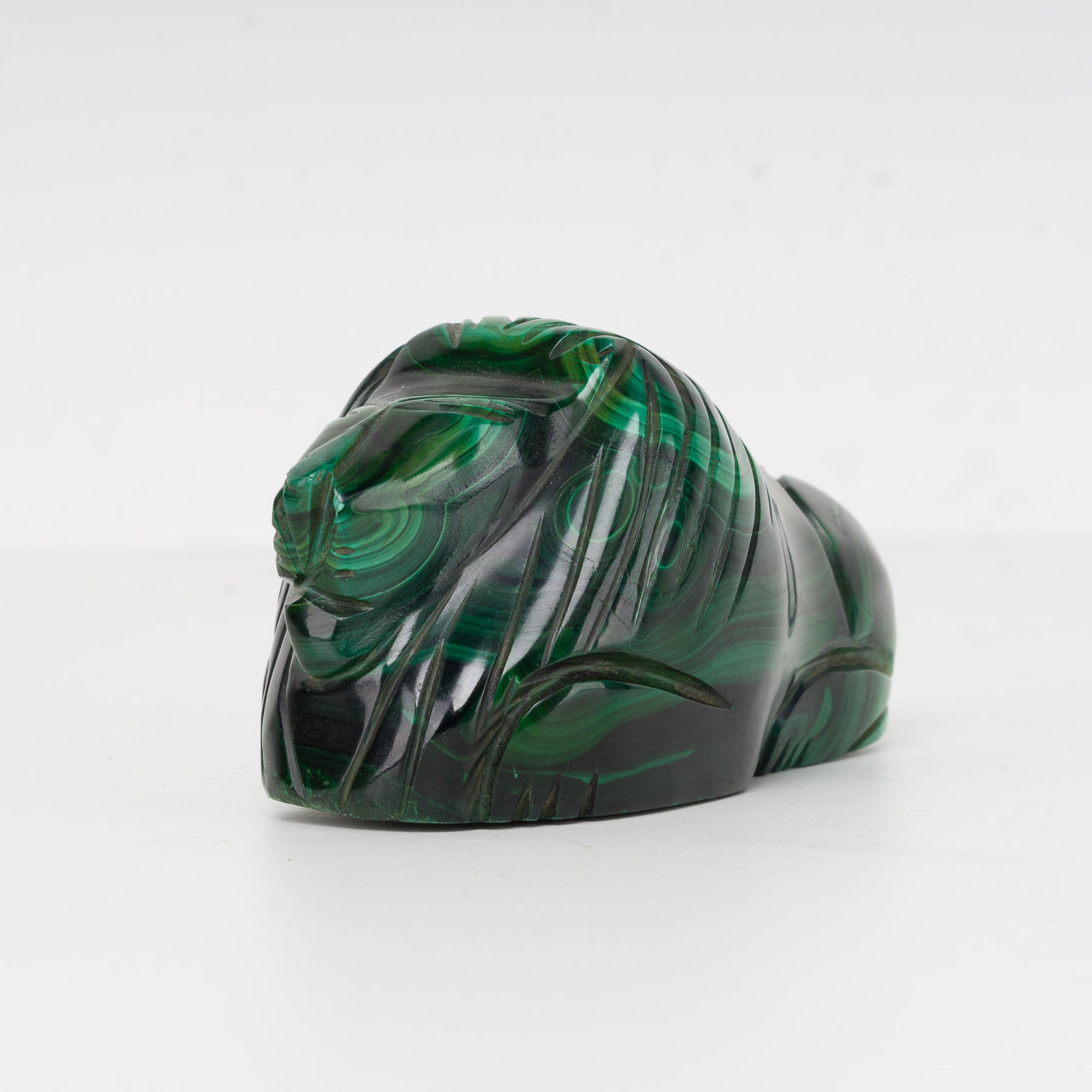 Dankzij zijn formaat is deze malachieten leeuw perfect geschikt als blikvanger op een bureau, in een vitrinekast, op een console of als onderdeel van een kunstzinnige stillevenopstelling. Het diepe groen combineert prachtig met hout, marmer, messing en andere natuurlijke materialen.