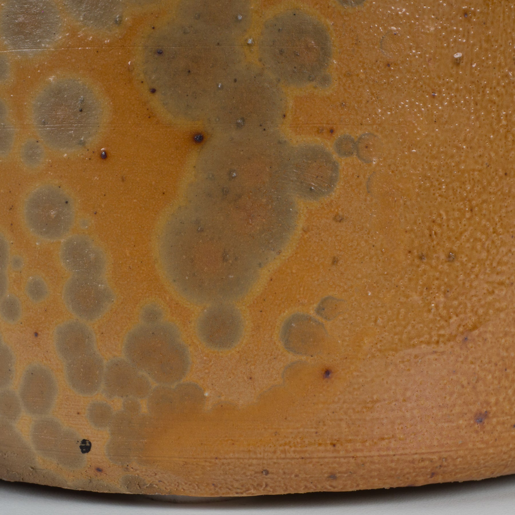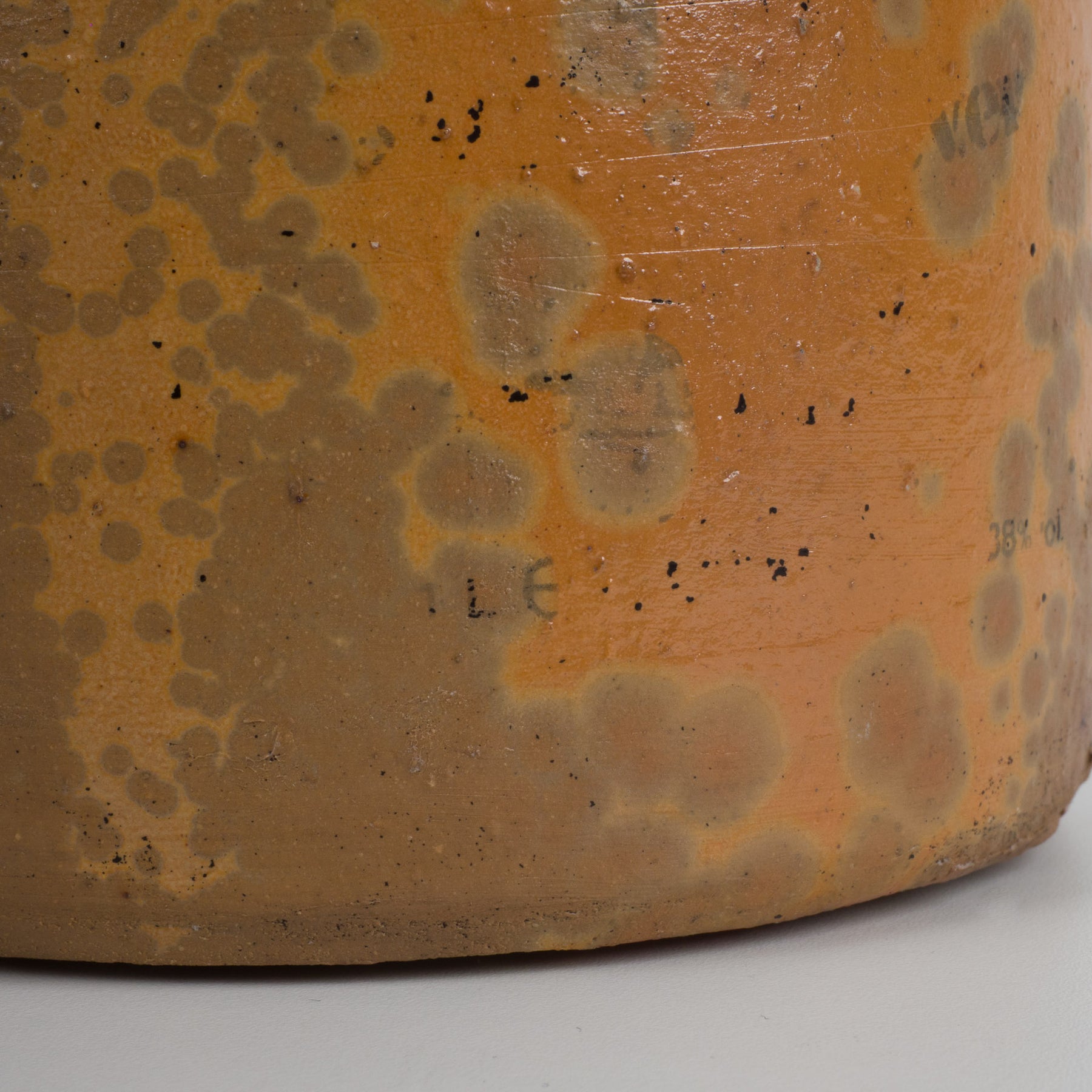 Het robuuste oor en de licht vernauwde hals versterken het ambachtelijke karakter. De zichtbare gebruikssporen, kleine imperfecties en patina getuigen van authenticiteit en leeftijd, wat dit stuk net zijn charme en echtheid verleent. Onderaan zijn viltjes aangebracht zodat de kruik veilig op een kast of tafel geplaatst kan worden.