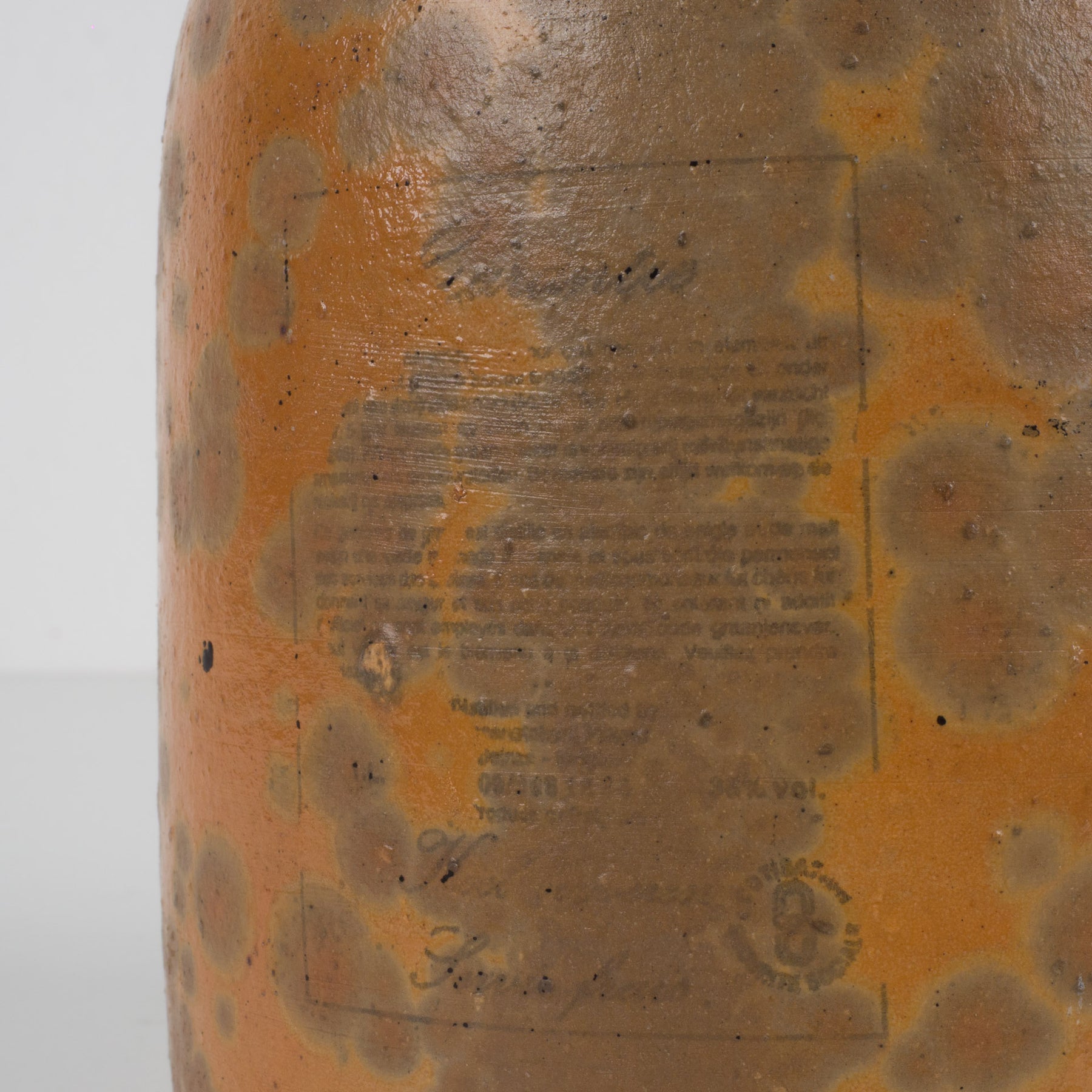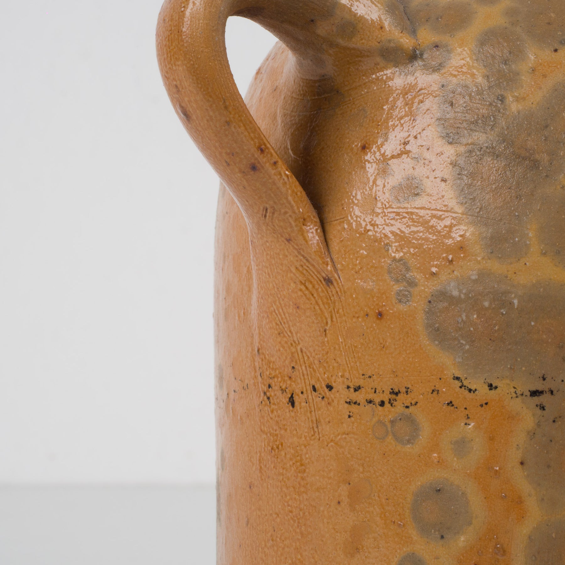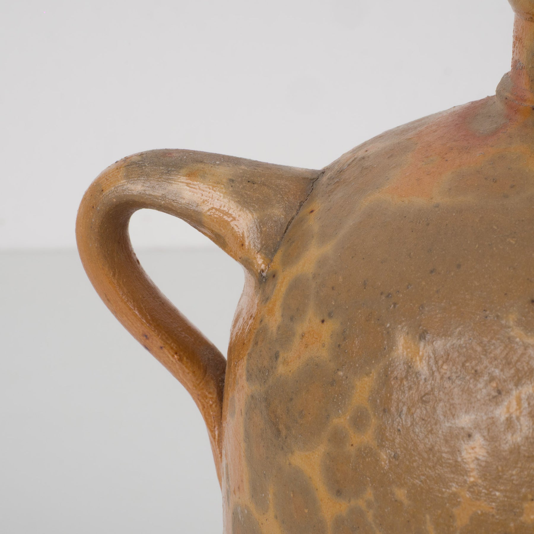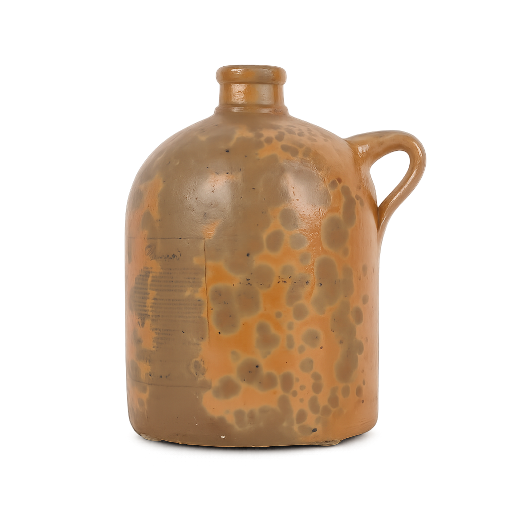 De kruik is vervaardigd uit aardewerk en afgewerkt met een levendige, gevlekte glazuurlaag in warme oker- en bruintinten. De natuurlijke kleurschakeringen en subtiele craquelé verraden het bakproces en geven het stuk een unieke, organische uitstraling. Dergelijke kruiken werden traditioneel gebruikt voor het bewaren van vloeistoffen zoals olie, azijn of sterke drank, maar vandaag komen ze vooral tot hun recht als decoratief object met een nostalgische ziel.