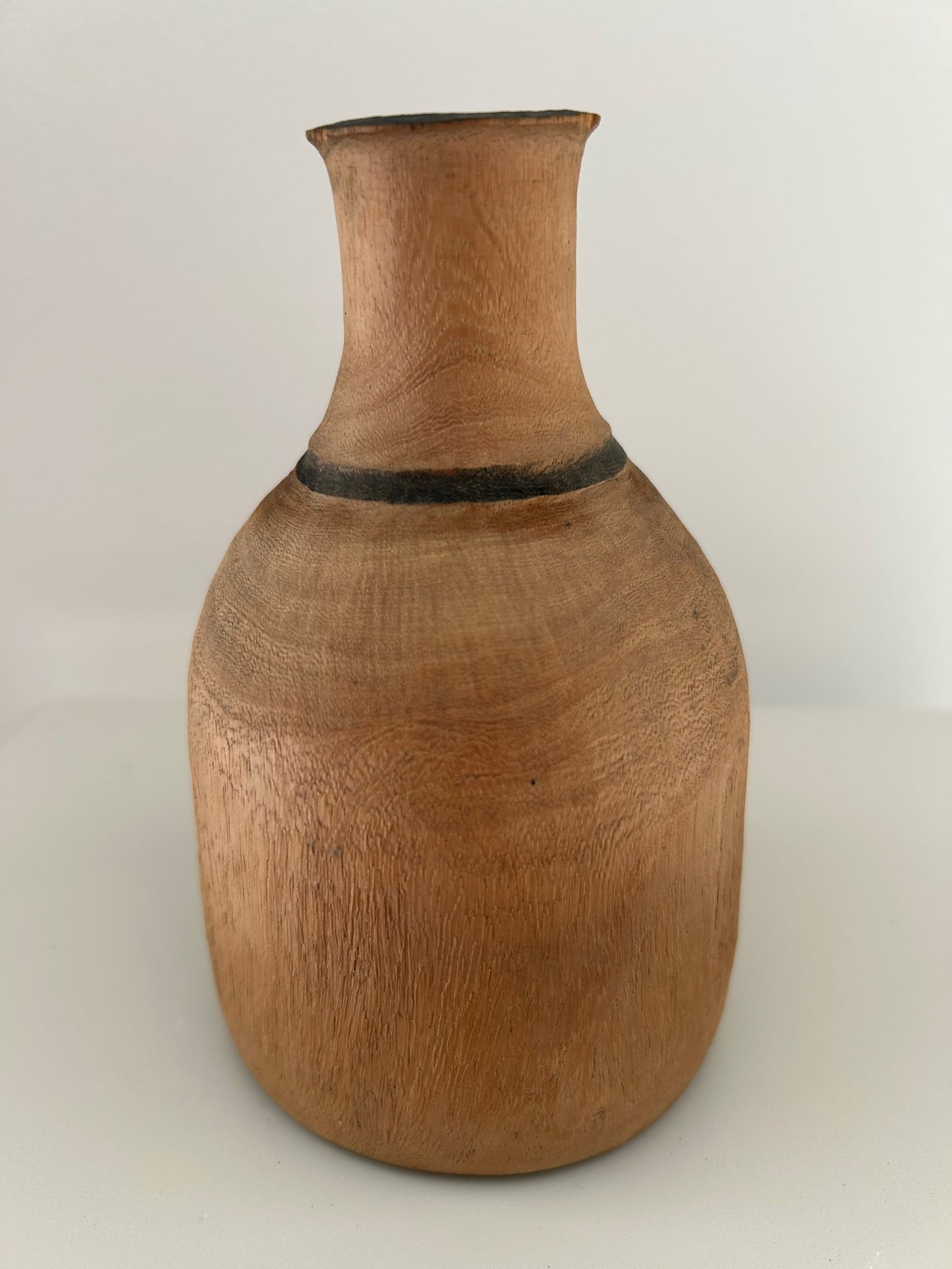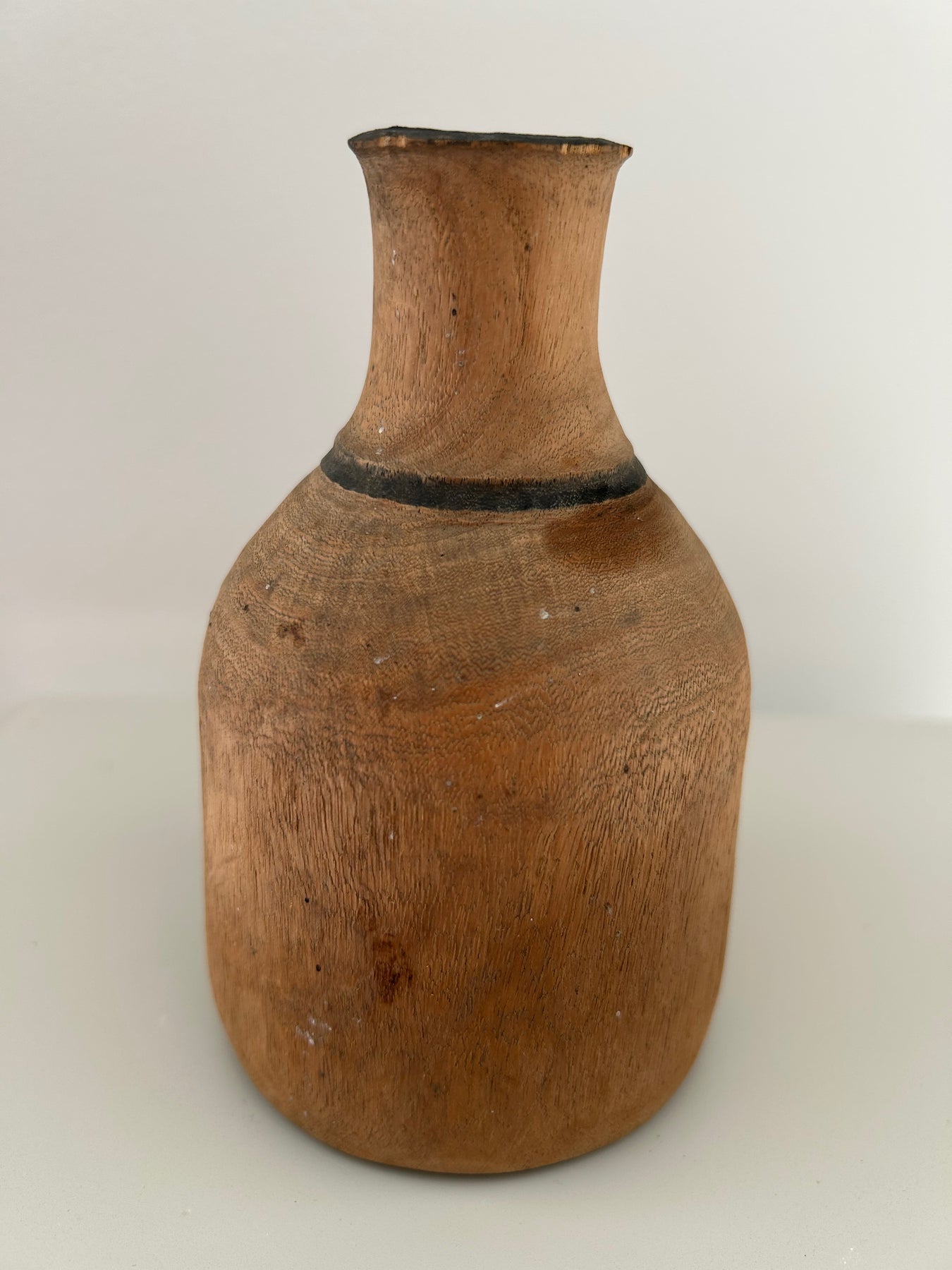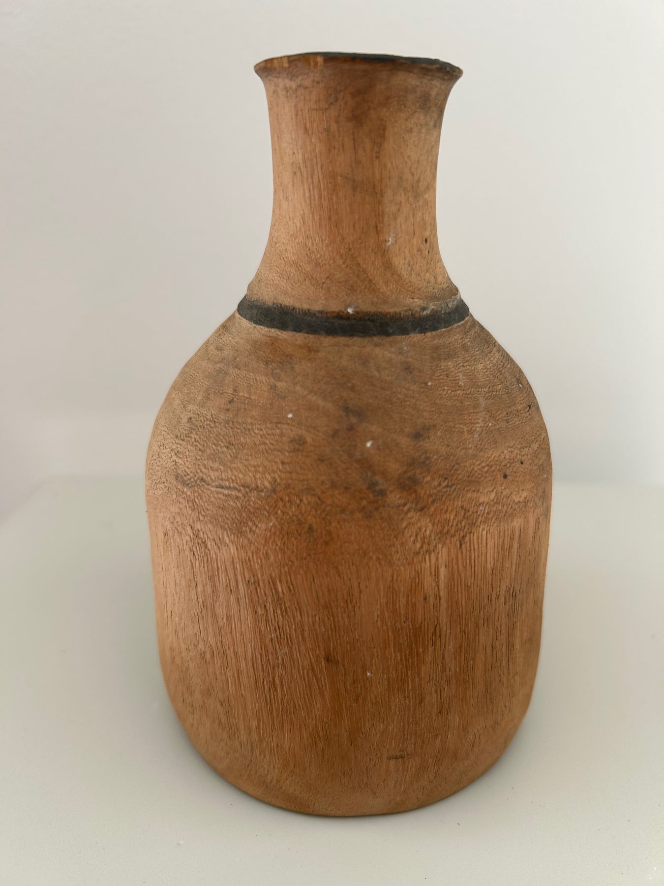 Soms zit schoonheid niet in perfectie, maar in het verhaal dat een object met zich meedraagt. Dit Afrikaanse houten vaasje is daar een prachtig voorbeeld van. Met zijn warme, honingbruine houtkleur en subtiele zwarte lijn rond de hals, straalt het een stille kracht uit — alsof het al vele interieurs heeft gezien en telkens opnieuw zijn plek vond.