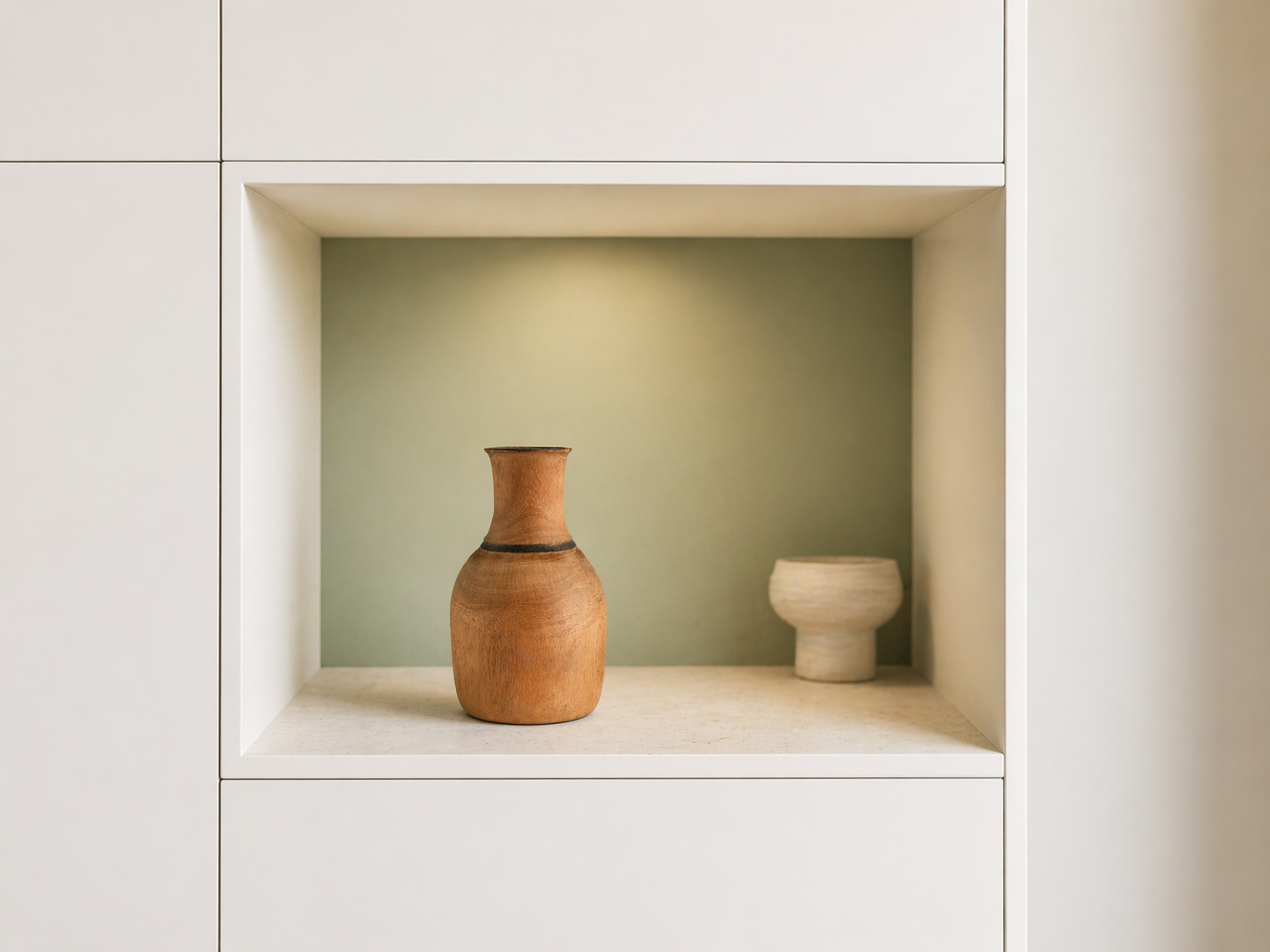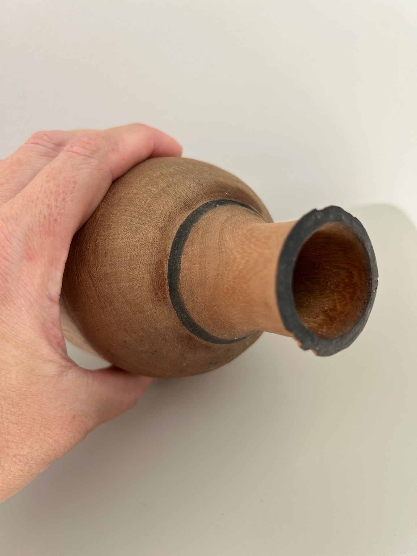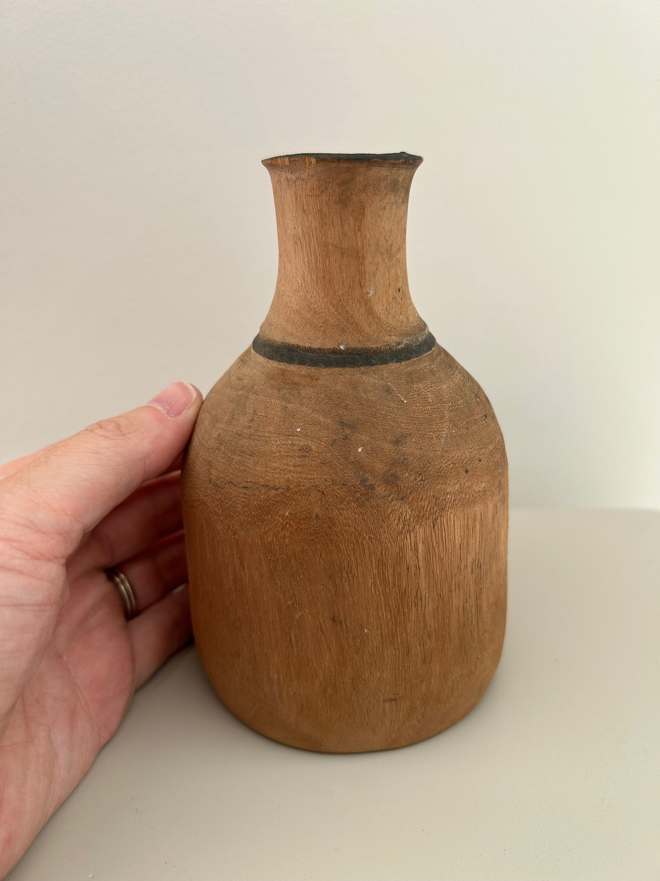 Soms zit schoonheid niet in perfectie, maar in het verhaal dat een object met zich meedraagt. Dit Afrikaanse houten vaasje is daar een prachtig voorbeeld van. Met zijn warme, honingbruine houtkleur en subtiele zwarte lijn rond de hals, straalt het een stille kracht uit — alsof het al vele interieurs heeft gezien en telkens opnieuw zijn plek vond.