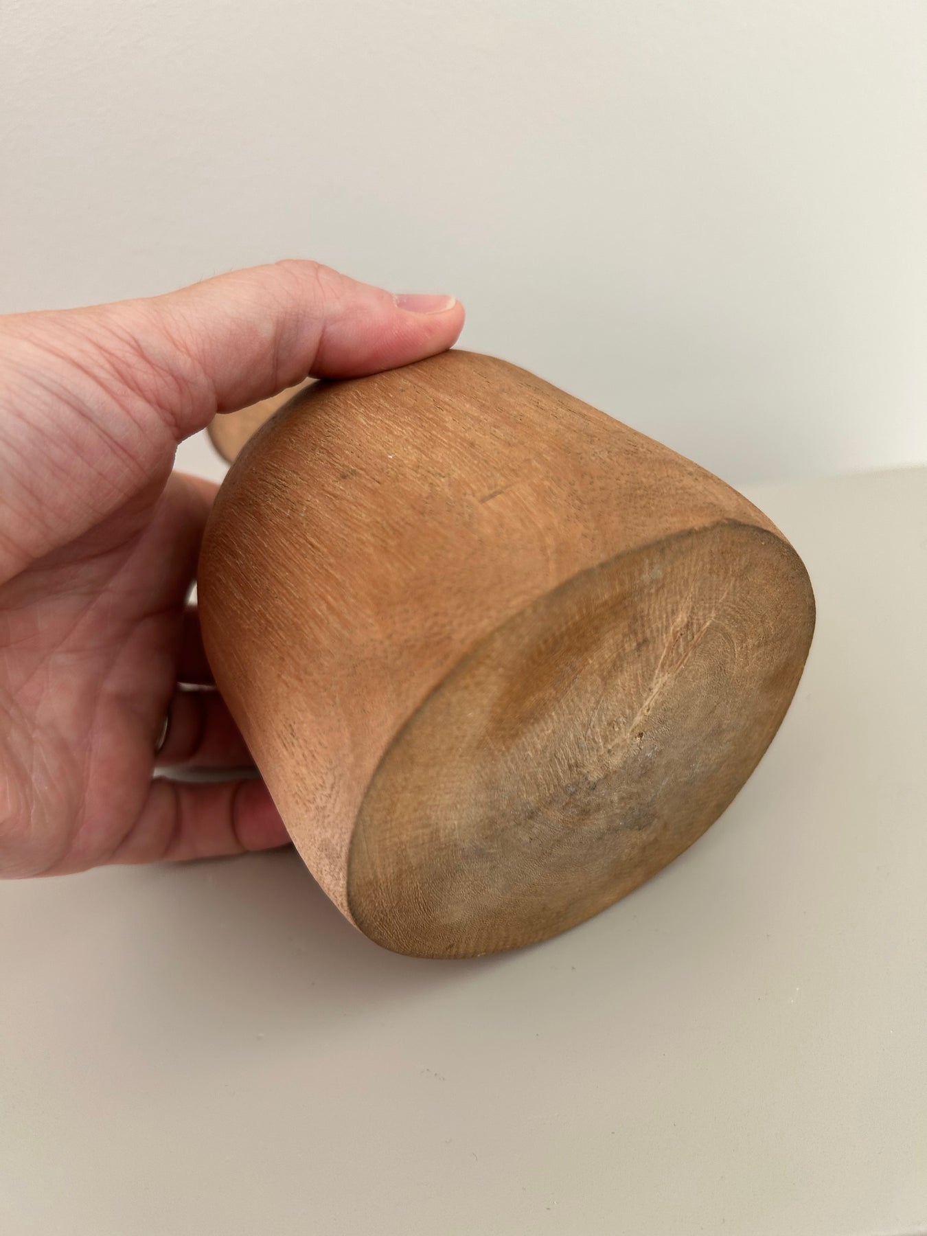 Dit houten vaasje past moeiteloos in verschillende interieurs: op een minimalistische plank, als warm contrast in een modern geheel, of als onderdeel van een speelse verzameling objecten. Gebruik het als decoratief stuk op zich, of met een paar fijne droogbloemen voor een extra zachte toets.