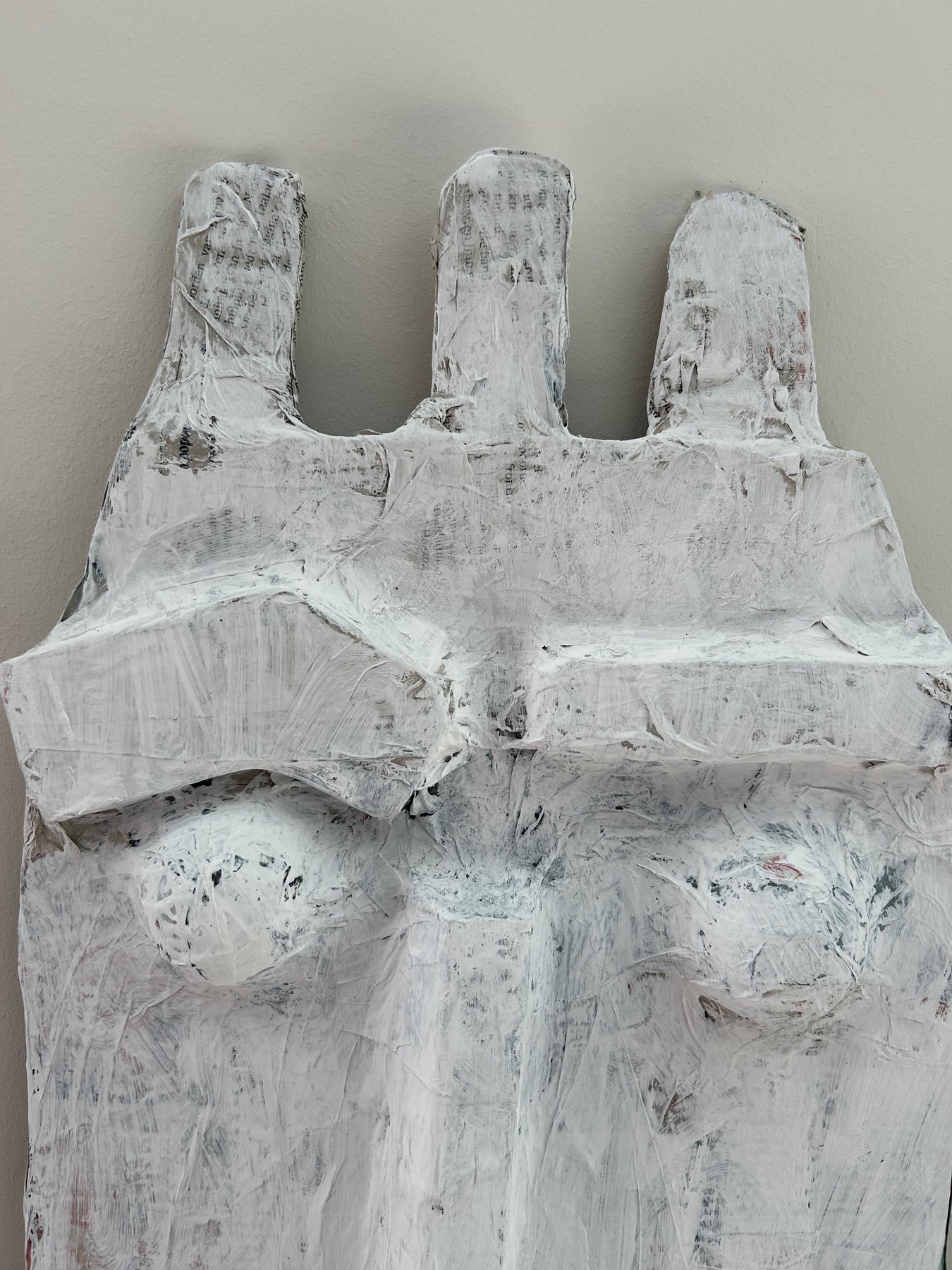 Dit intrigerende masker in papier-maché lijkt uit stilte geboetseerd. De zachte, bijna krijtachtige witte laag verbergt en onthult tegelijk: sporen van krantenpapier, handenarbeid en tijd die voelbaar aanwezig blijft in elke plooi en elke oneffenheid.