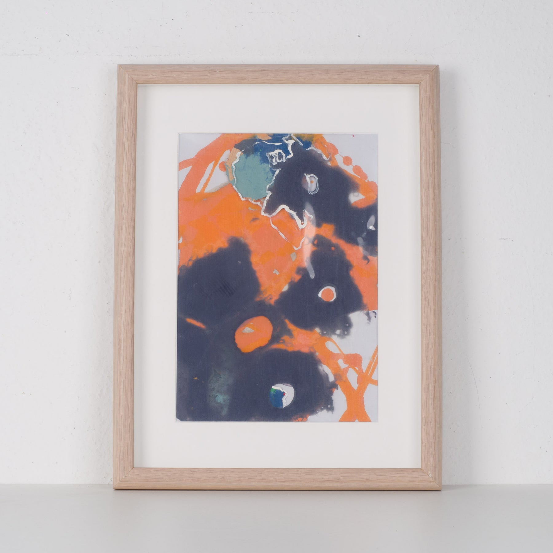 De krachtige combinatie van warm oranje en diep indigo wordt verzacht door zachte witte lijnen en transparante accenten. Organische vormen lijken te zweven tussen de lagen, wat het werk een bijna kosmische of cartografische uitstraling geeft. Elk detail onthult nieuwe nuances – een schilderij dat blijft boeien en uitnodigt om dichterbij te komen.