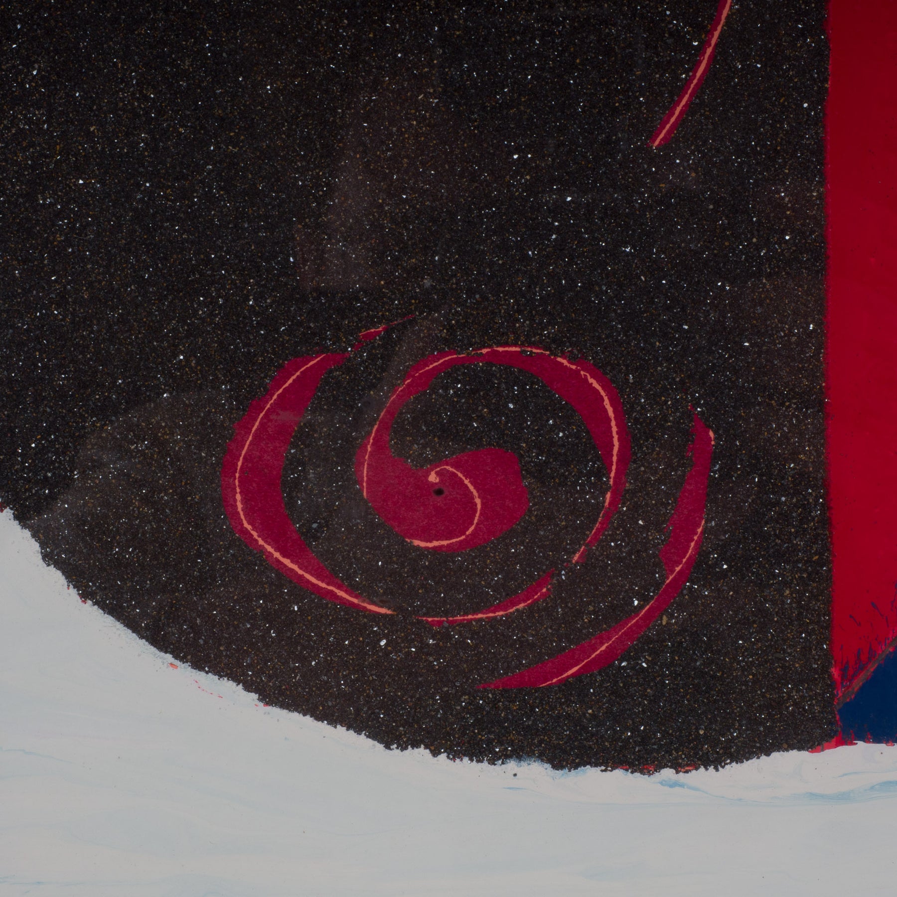 Dit abstracte schilderij uit 1991, uitgevoerd in gemengde techniek, vormt een krachtig samenspel van kleur, contrast en ritme. De expressieve combinatie van rood, blauw en zwart, aangevuld met subtiele pinkeling, creëert een dynamische compositie waarin spanning en evenwicht elkaar afwisselen. Dankzij de gelaagdheid en rijke texturen blijft het werk boeien en nodigt het uit tot herhaald kijken.