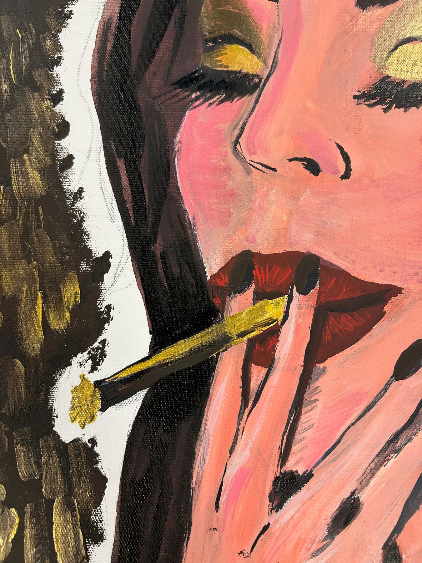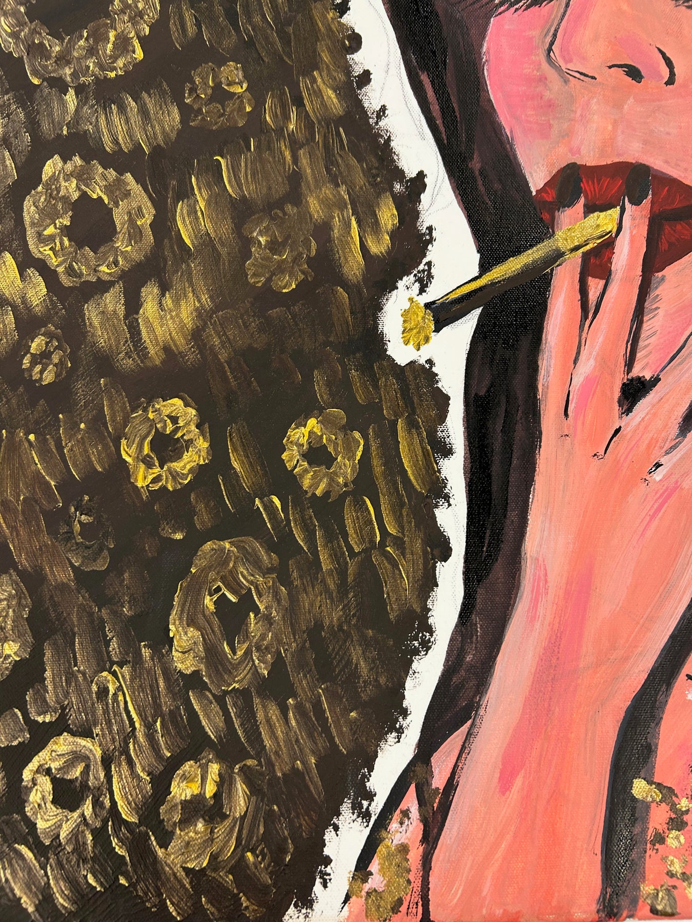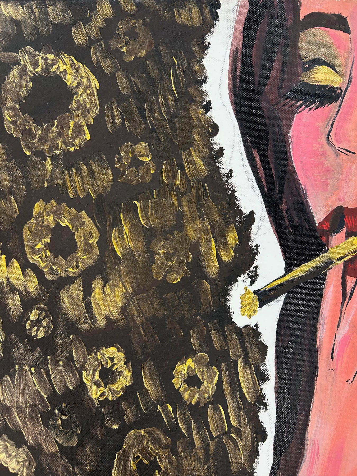 De vrouw, verzonken in een moment van stilte, ademt een zekere intimiteit en zelfbewustzijn. Het contrast tussen het abstracte, goudbruine patroon en het figuratieve portret creëert een boeiende dialoog tussen decoratie en emotie. Dit maakt het schilderij zowel visueel sterk als sfeervol aanwezig in een interieur.
