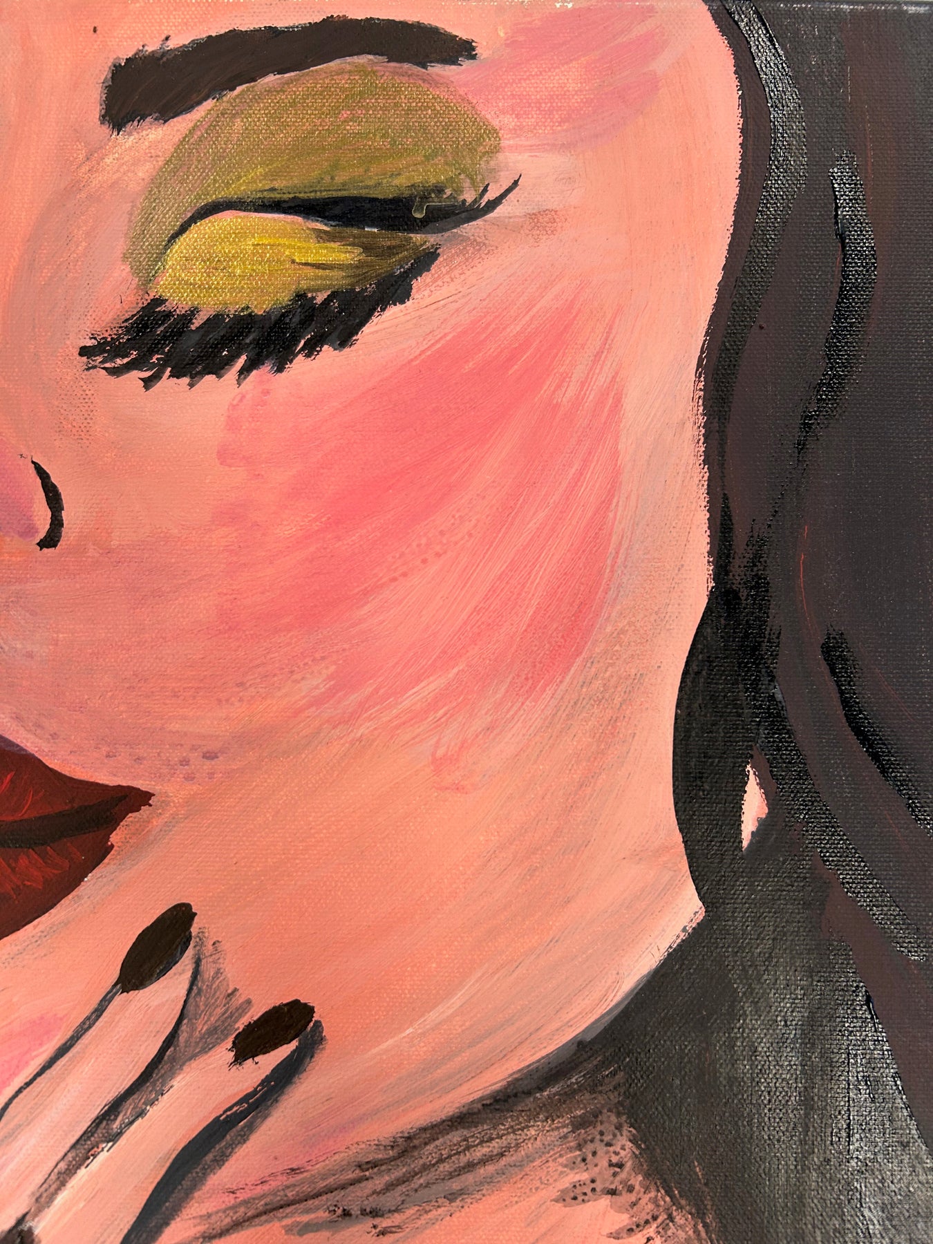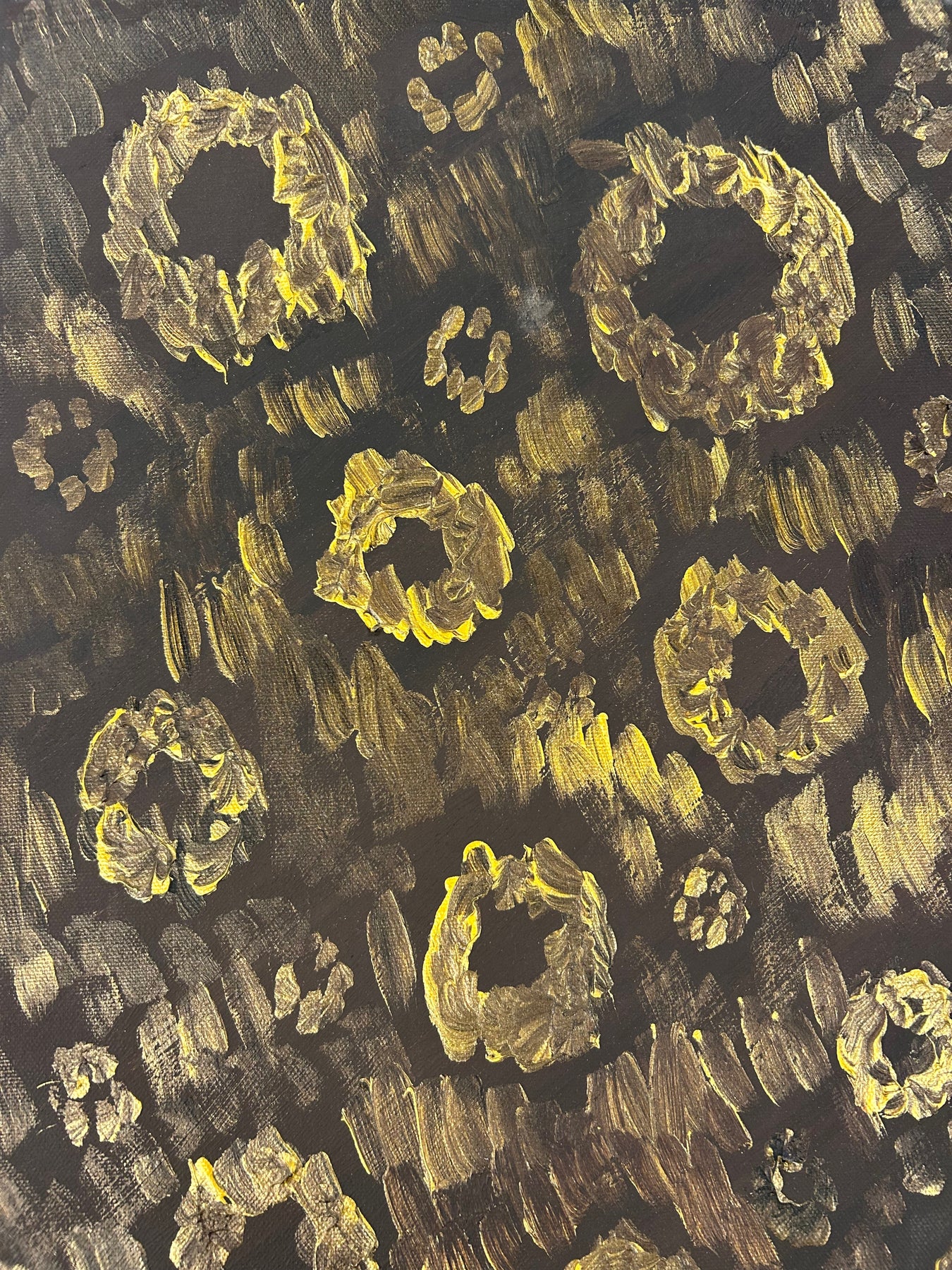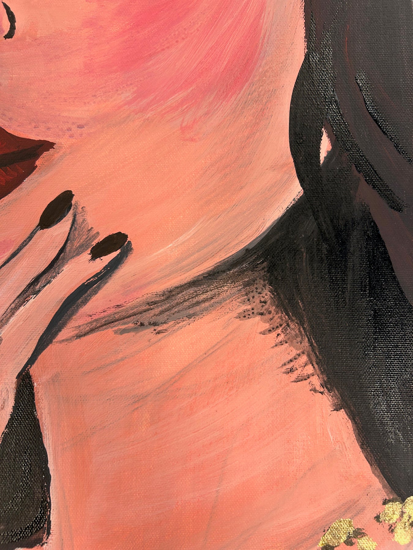 De vrouw, verzonken in een moment van stilte, ademt een zekere intimiteit en zelfbewustzijn. Het contrast tussen het abstracte, goudbruine patroon en het figuratieve portret creëert een boeiende dialoog tussen decoratie en emotie. Dit maakt het schilderij zowel visueel sterk als sfeervol aanwezig in een interieur.