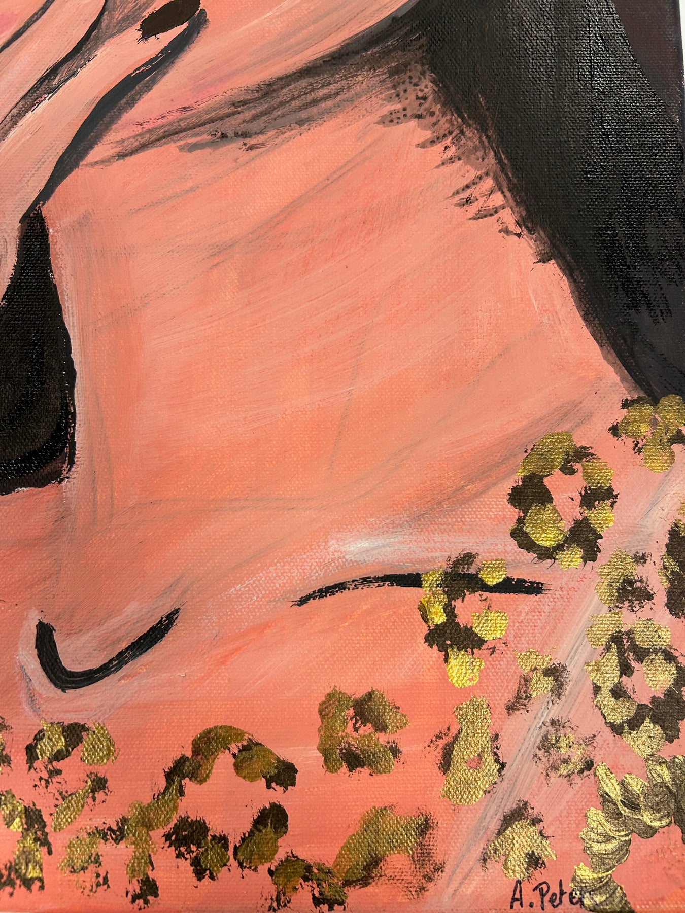 Dit expressieve schilderij van A. Peters (50 × 70 cm) toont een vrouwelijk portret vol rust en spanning tegelijk. De compositie is krachtig opgebouwd uit warme huidtinten, diepe zwarte accenten en een rijk palet van bruin en goud. De gouden toetsen zorgen voor een subtiele glans en geven het werk een luxueuze, bijna tactiele uitstraling, zonder zijn zachtheid te verliezen.