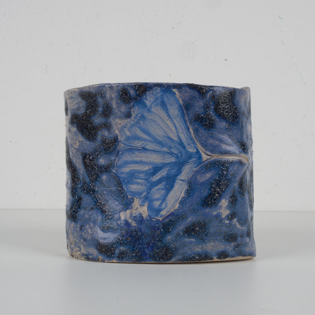 Blauw keramisch potje met bladmotief – Handgemaakt en gesigneerd – 15x13x13 cm