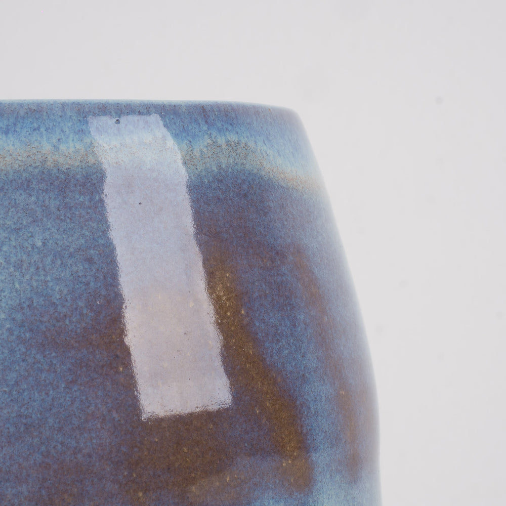 Handgemaakt keramisch vaasje – bruin met blauw geglazuurd blad – gesigneerd – 6 x 5,5 x 15 cm
