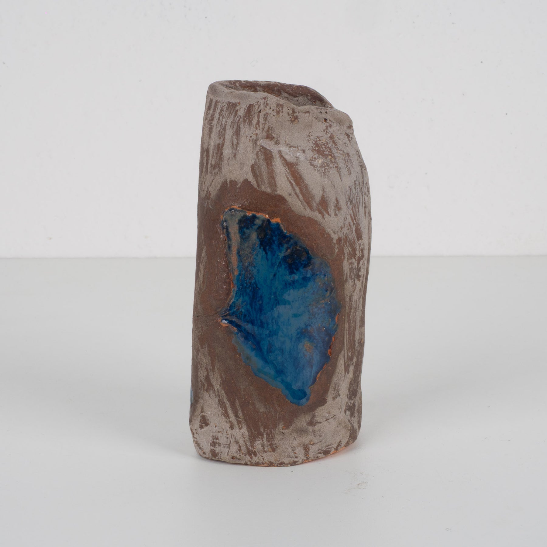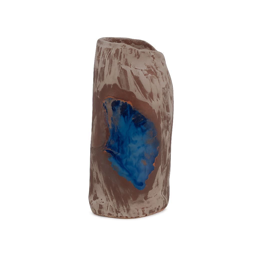 Het blauwe blad lijkt als een fossiel of afdruk in de aarde gevangen. Het geeft het vaasje een bijna archeologische uitstraling – alsof natuur en tijd samen een verhaal hebben geschreven in klei. Het contrast tussen het matte bruin en het glanzende blauw creëert een boeiende spanning tussen ruw en verfijnd, tussen aarde en water.