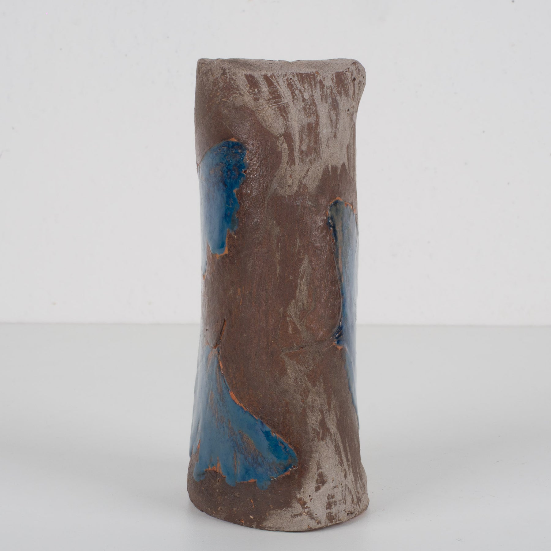 Met zijn compacte afmetingen van 6 x 5,5 x 15 cm is dit vaasje klein van formaat, maar groots in uitstraling. De organische vorm – licht onregelmatig en bewust ruw gelaten – benadrukt het ambachtelijke proces. De textuur van de ongeglazuurde klei straalt warmte en puurheid uit, terwijl het blauw geglazuurde blad een levendig accent toevoegt dat doet denken aan water, oxidatie en natuurlijke erosie.