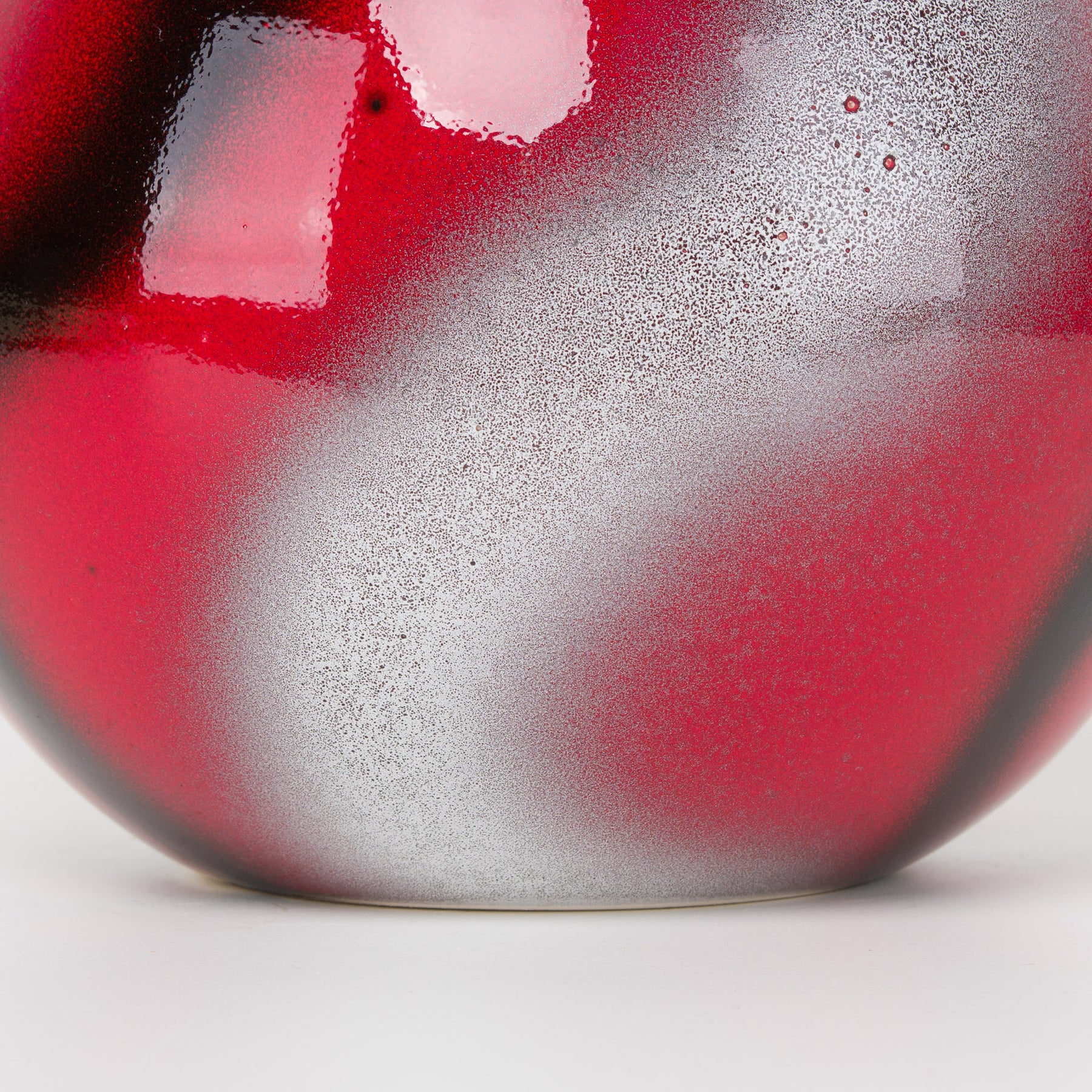 De glanzende, licht gemêleerde afwerking creëert een levendig spel van licht en reflectie. De combinatie van diep rood met zilverachtige nuances en donkere schakeringen geeft de vaas een bijna kosmisch effect — krachtig maar verfijnd. Dankzij de bolvorm komt ze zowel solo tot haar recht als in combinatie met sobere takken of bloemen.