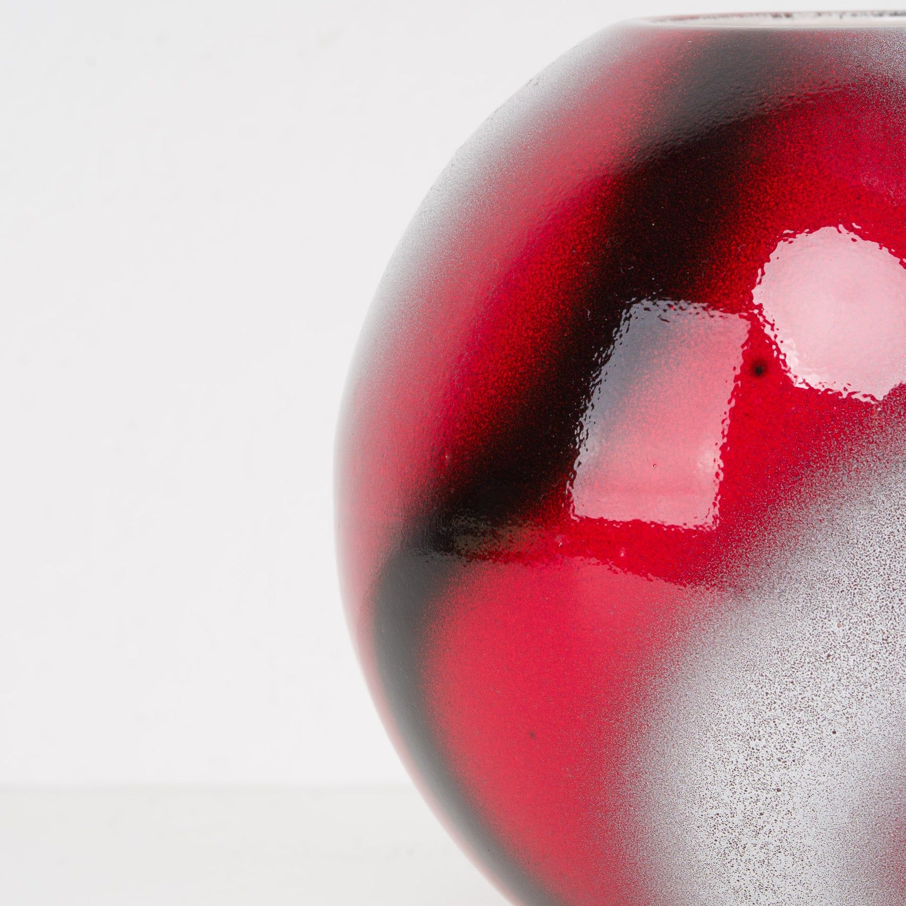 Deze opvallende rode vintage bolvaas van Sélémen France is een krachtig decoratief object met een uitgesproken jaren ’60-’70 uitstraling. De harmonieuze bolvorm (20 cm diameter, 18 cm hoog) zorgt voor een zachte, evenwichtige aanwezigheid in elk interieur, terwijl het intense rood subtiel overvloeit in zilverachtige en donkere accenten.