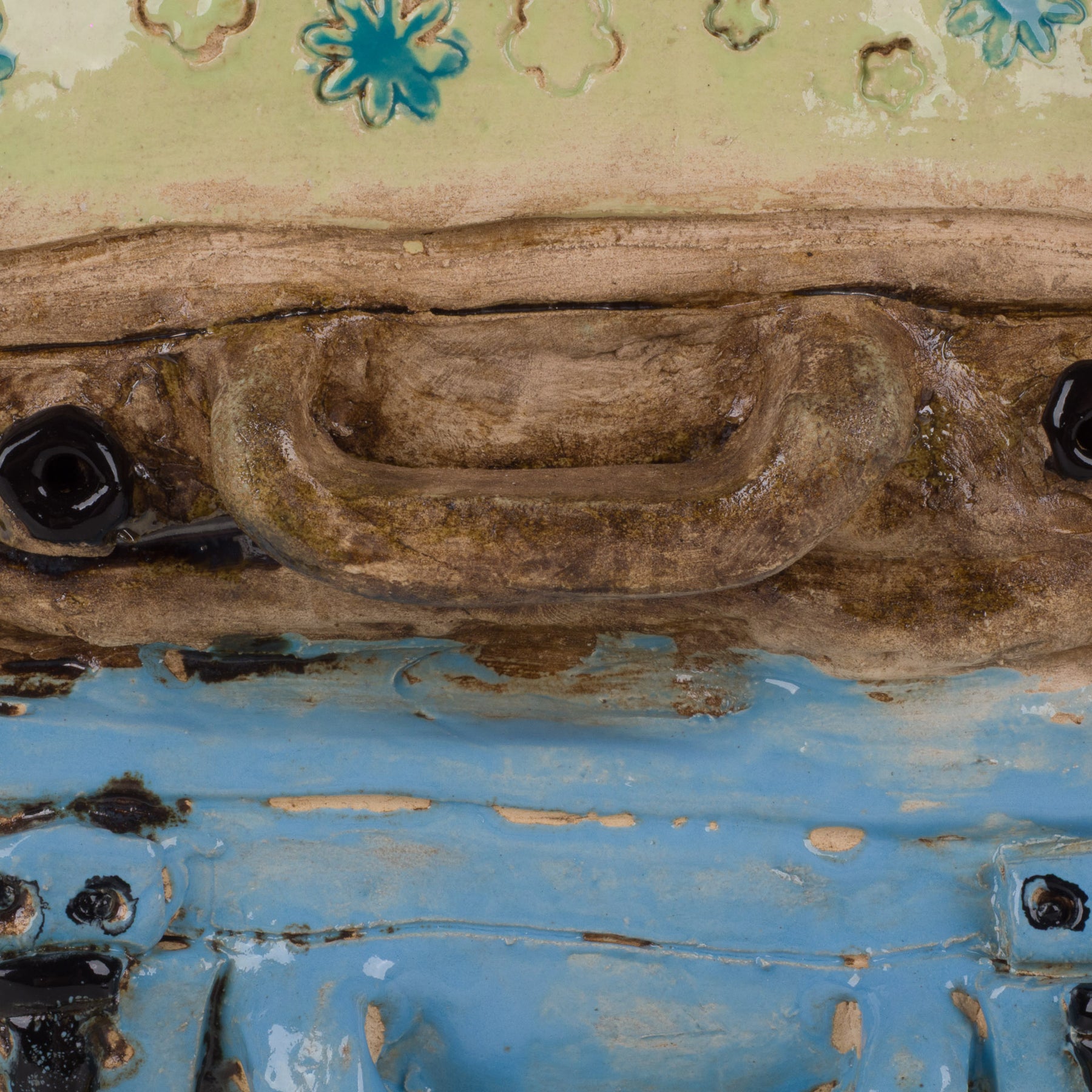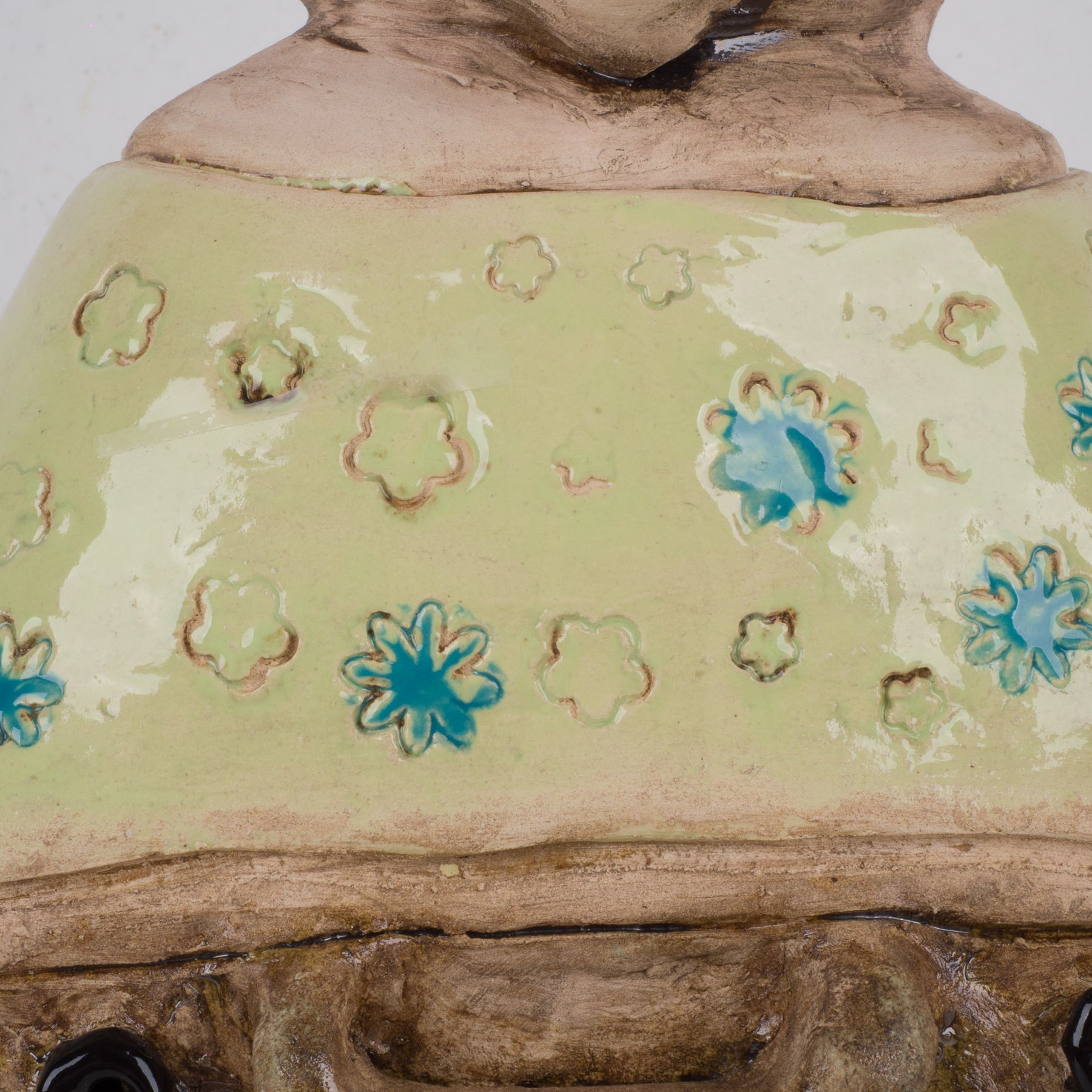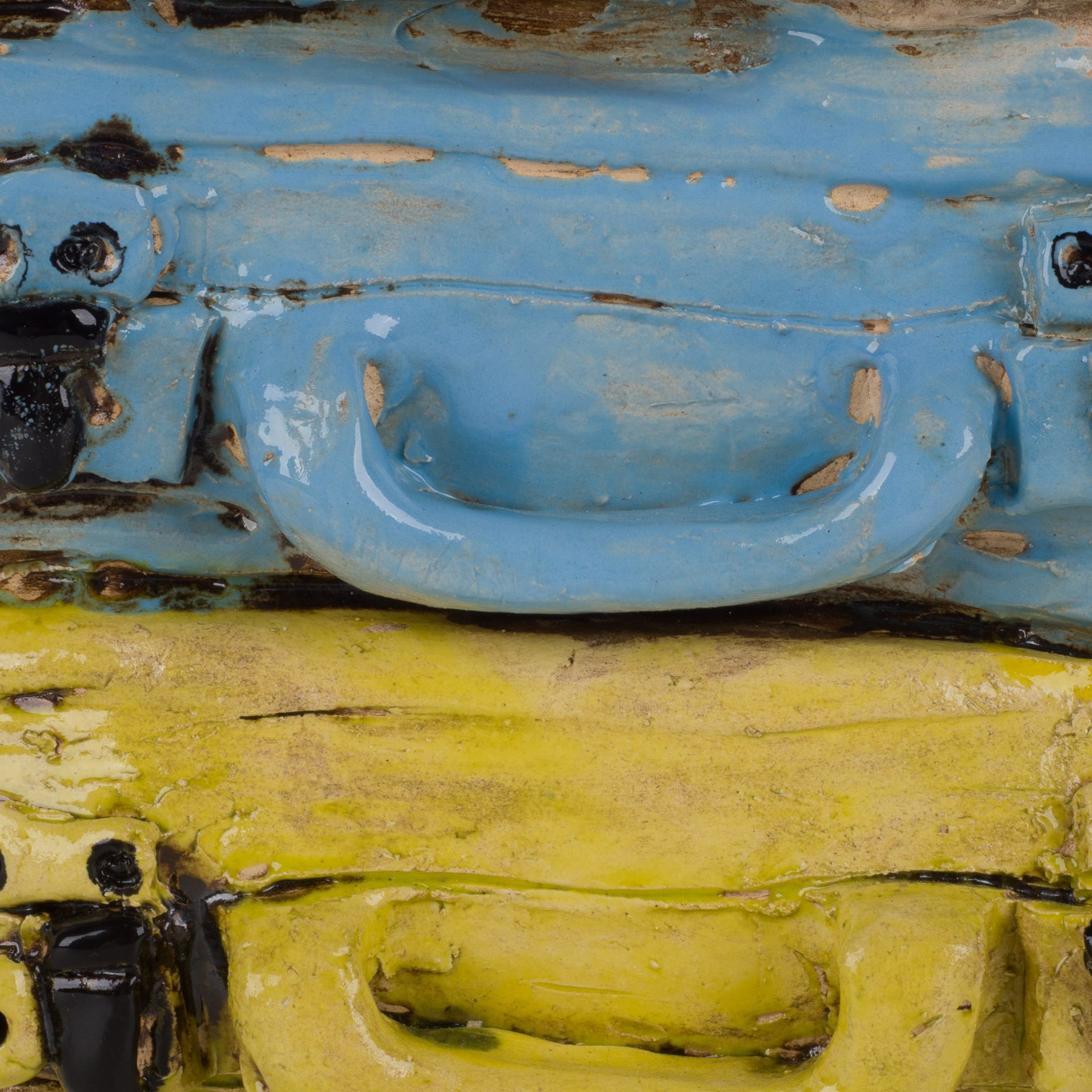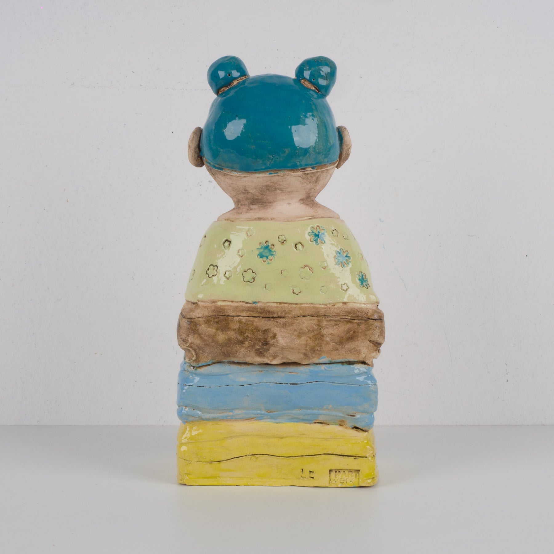 This cheerful and colorful handmade ceramic sculpture, "The Traveler," brings instant happiness to any room. The artwork depicts a charming figure whose bust playfully balances on a tower of three suitcases. The playful depiction, combined with the rich colors and meticulous workmanship, makes this piece a true eye-catcher.