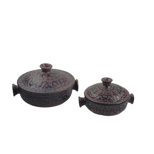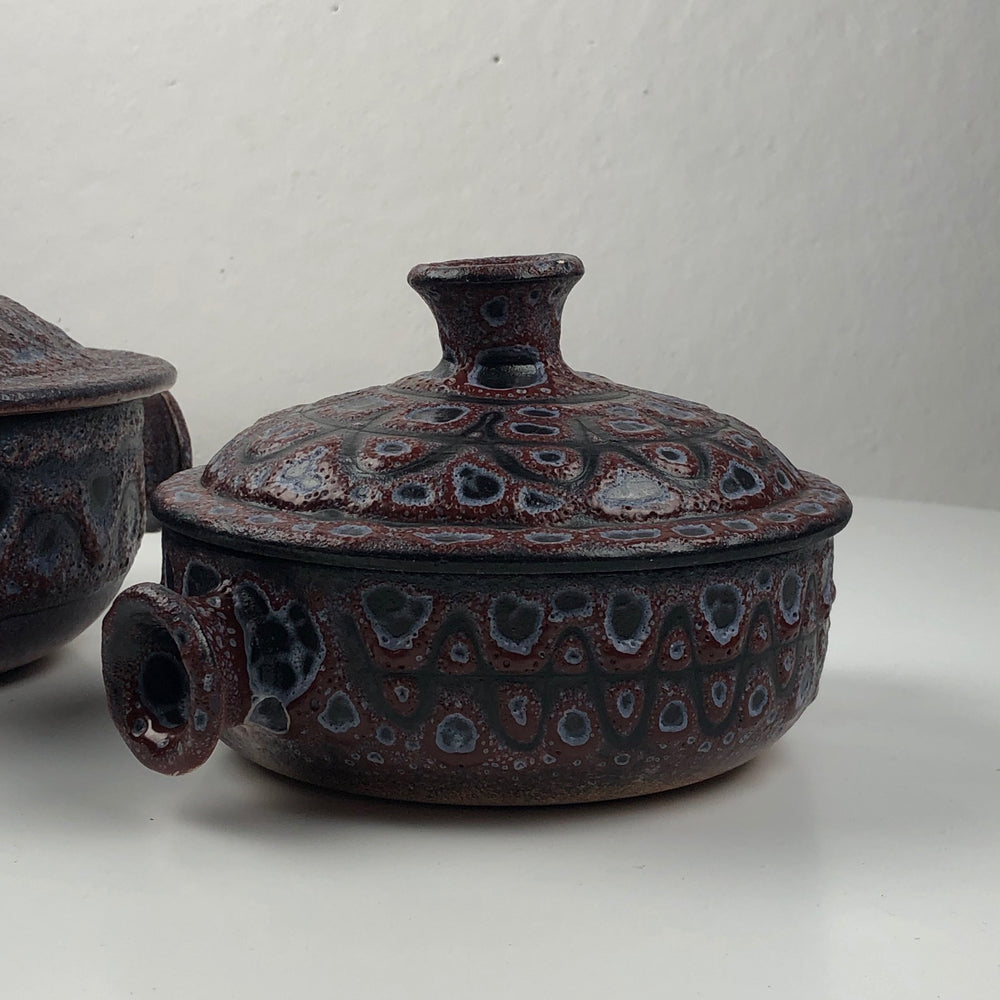 Ceramic set by Jean Austruy We proudly present a beautiful ceramic set by the talented artist Jean Austruy. Jean Austruy (November 24, 1910 - November 2012), born in the south of France, graduated from art school in Paris and left a lasting impression in the world of ceramics with his work. The set consists of two pots with lids and two handles each, in a timeless and elegant design. The dimensions of the pots are 23 x 27 x 14 cm and 22 x 18 x 11 cm, which makes them perfect for different applications and spaces in your interior.