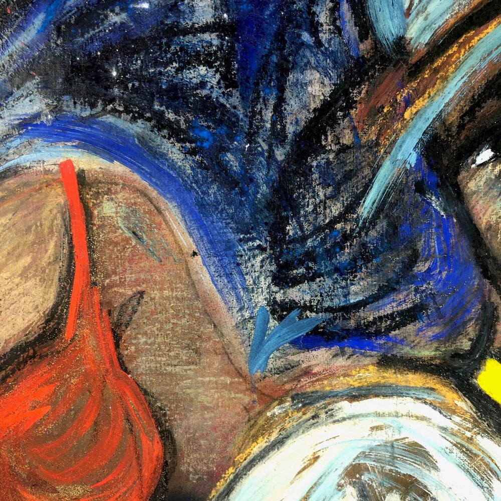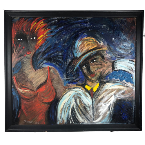 The centerpiece of this collage is a modern painting with characters, which gives a unique and artistic look to the space. The vibrant colors of blue and red are beautifully reflected in this work of art, making it a real eye-catcher.