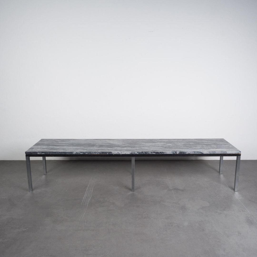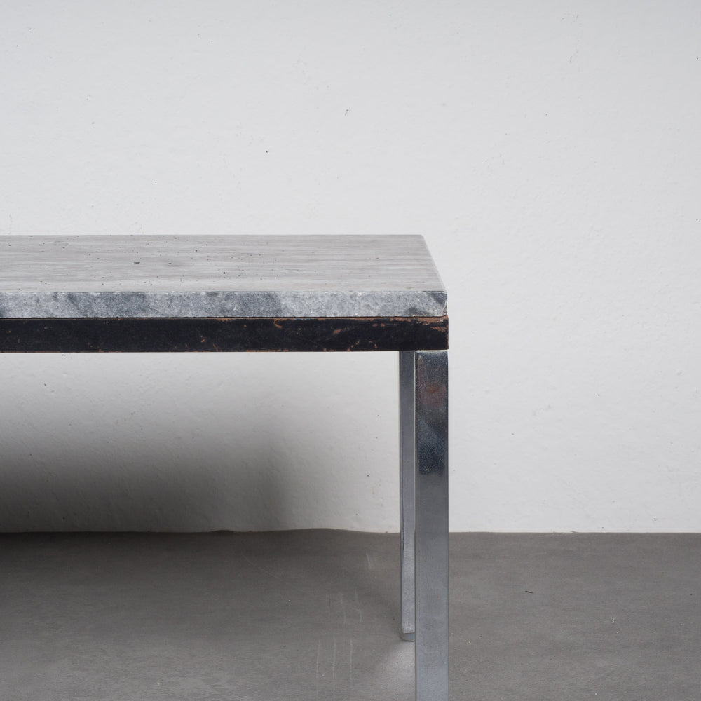 This unique interior collage creatively combines the deep black, beautifully expressed in the modern photo of the black woman and the coffee table by Knoll, with the refined petroleum blue of the base and the agate stone. The vibrant green in the ceramic vase adds a refreshing and natural element to the whole.