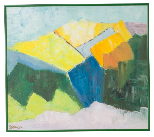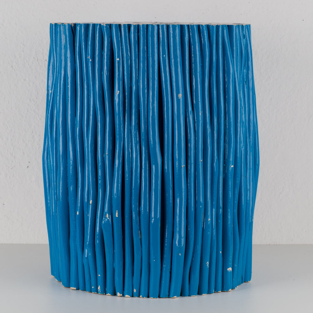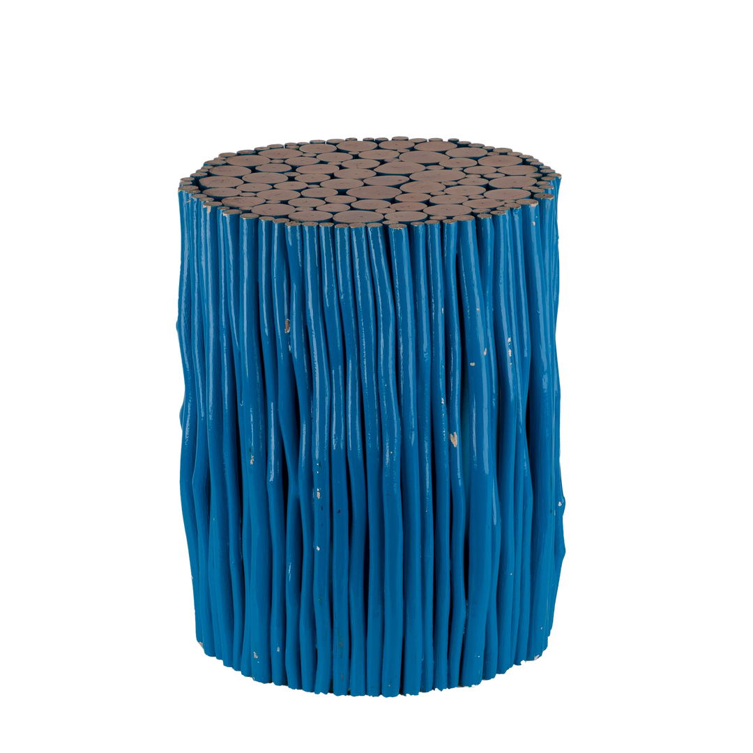 This interior composition harmoniously combines the lively apple blue sea green, which is beautifully expressed in the nice authentic wooden stool and in the modern mouth-blown bowl, with the cheerful yellow and orange of the colorful abstract painting.