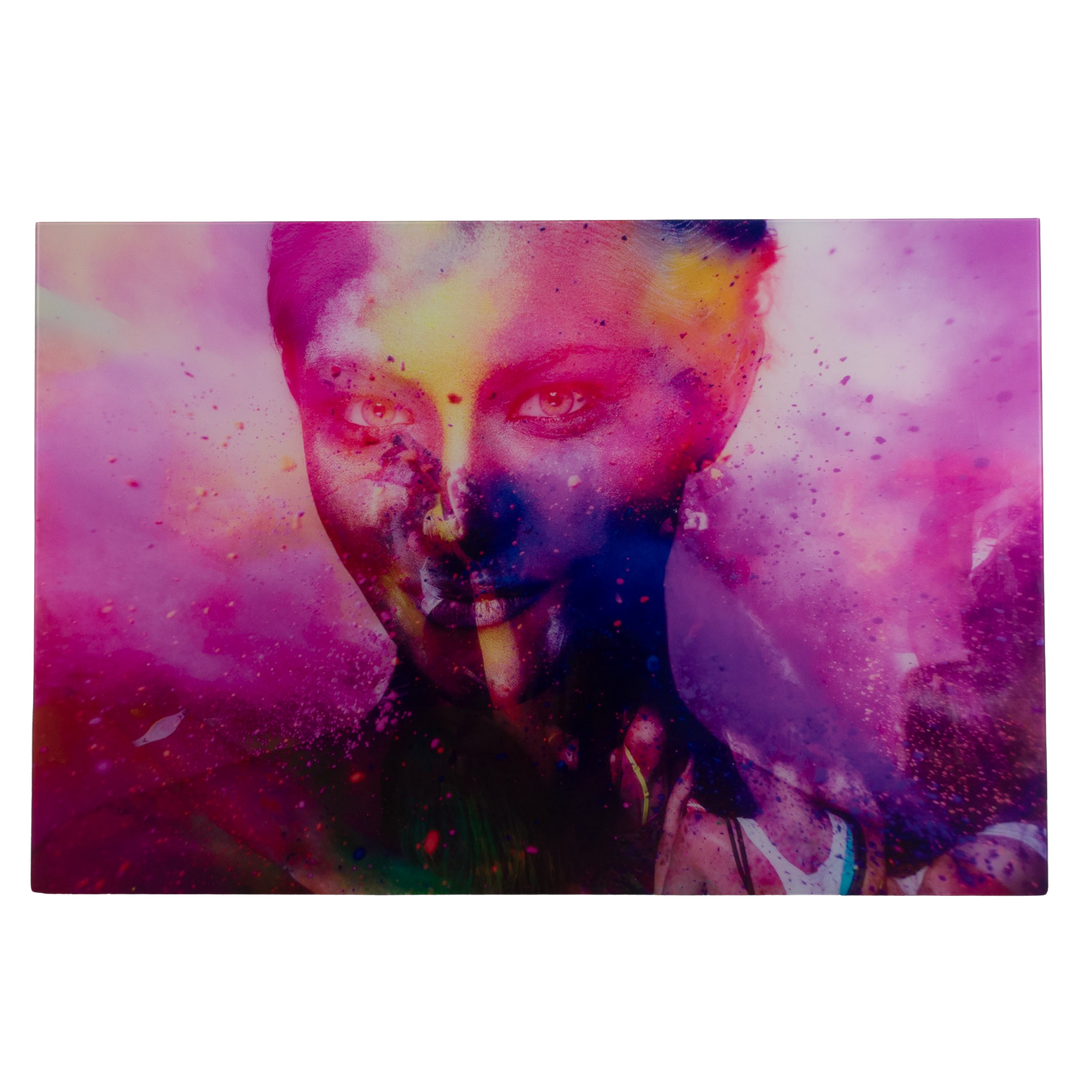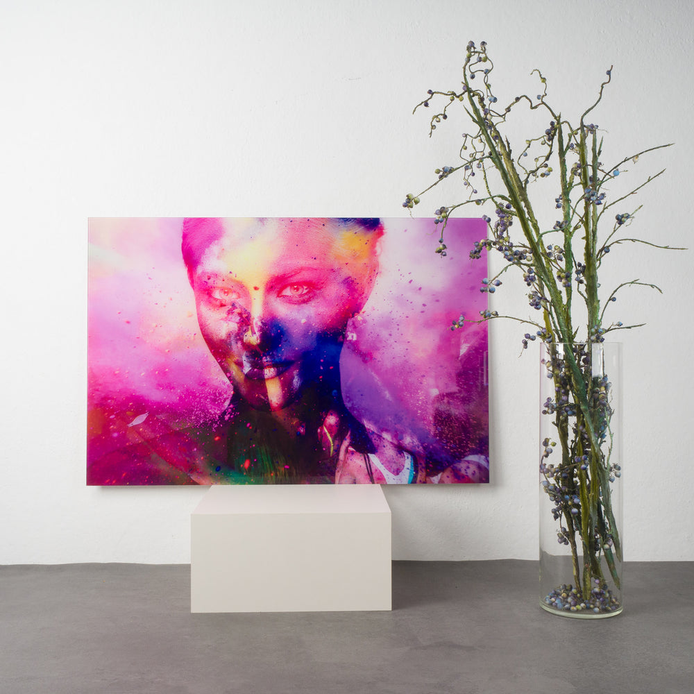 This interior composition is characterized by the harmony between the soft pink, the deep purple and the bright white. The striking focal point of this composition is the glass photo of a modern woman, which adds a sense of style and class to the space.