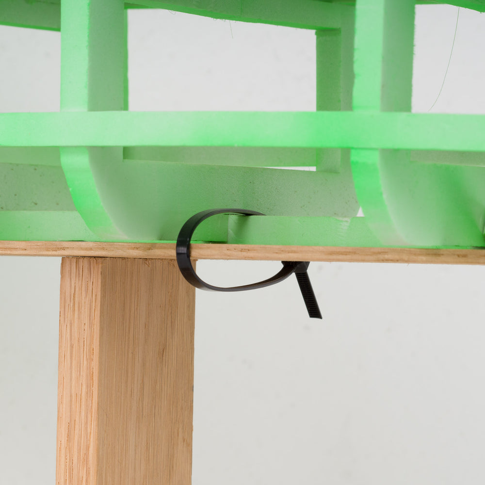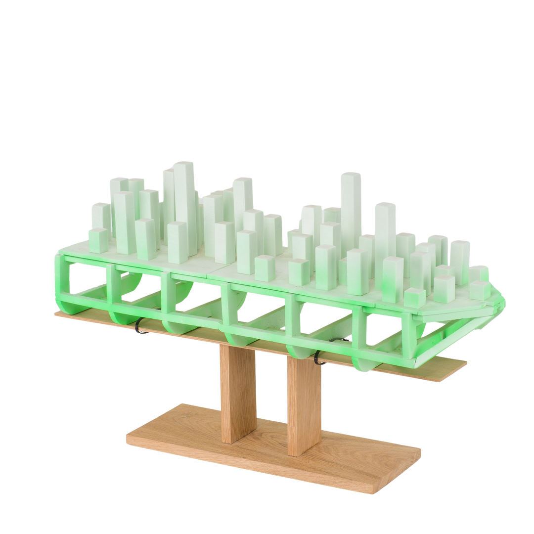 Discover the perfect balance between color, shape and texture with this beautiful composition. The green of the artwork of the fluorescent boat in Styrofoam forms a lively counterpart to the black and white of the photo of the woman and Mannaers' artwork.