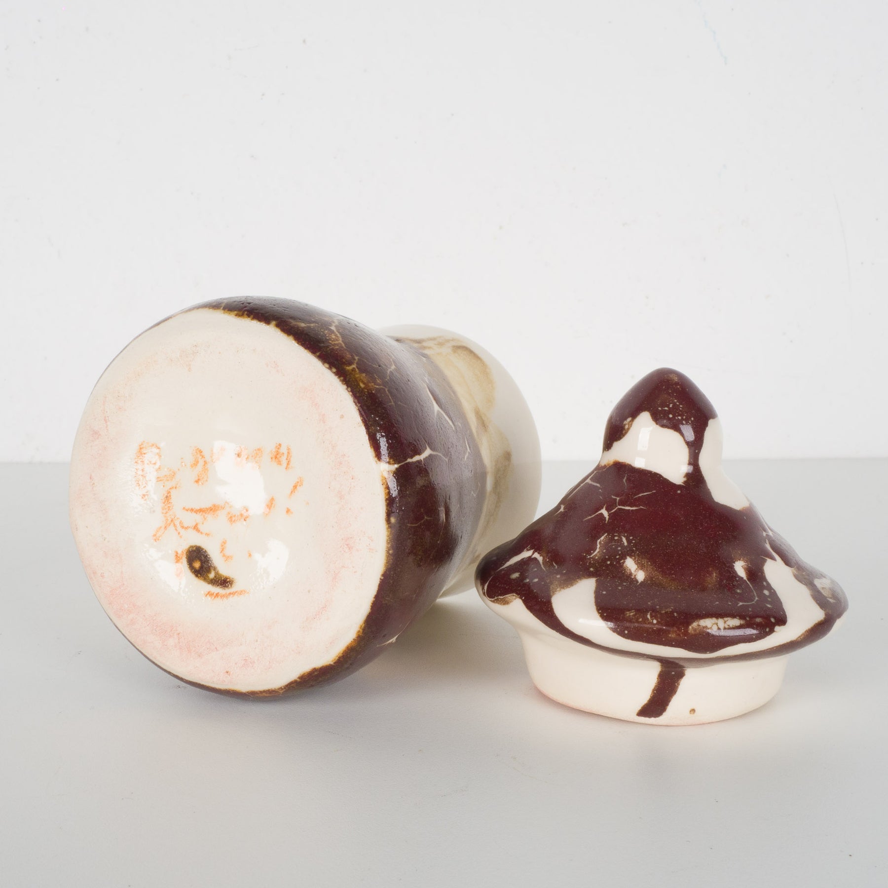 A charming brown ceramic jar with a lid, designed by French ceramist Bob Chiffin from Pegomas . This handcrafted piece (8x8x16 cm) clearly bears his signature on the underside and exudes the warmth and craftsmanship of Southern French ceramics. Its subtle sheen and natural tones make it a refined yet playful accent in any interior.