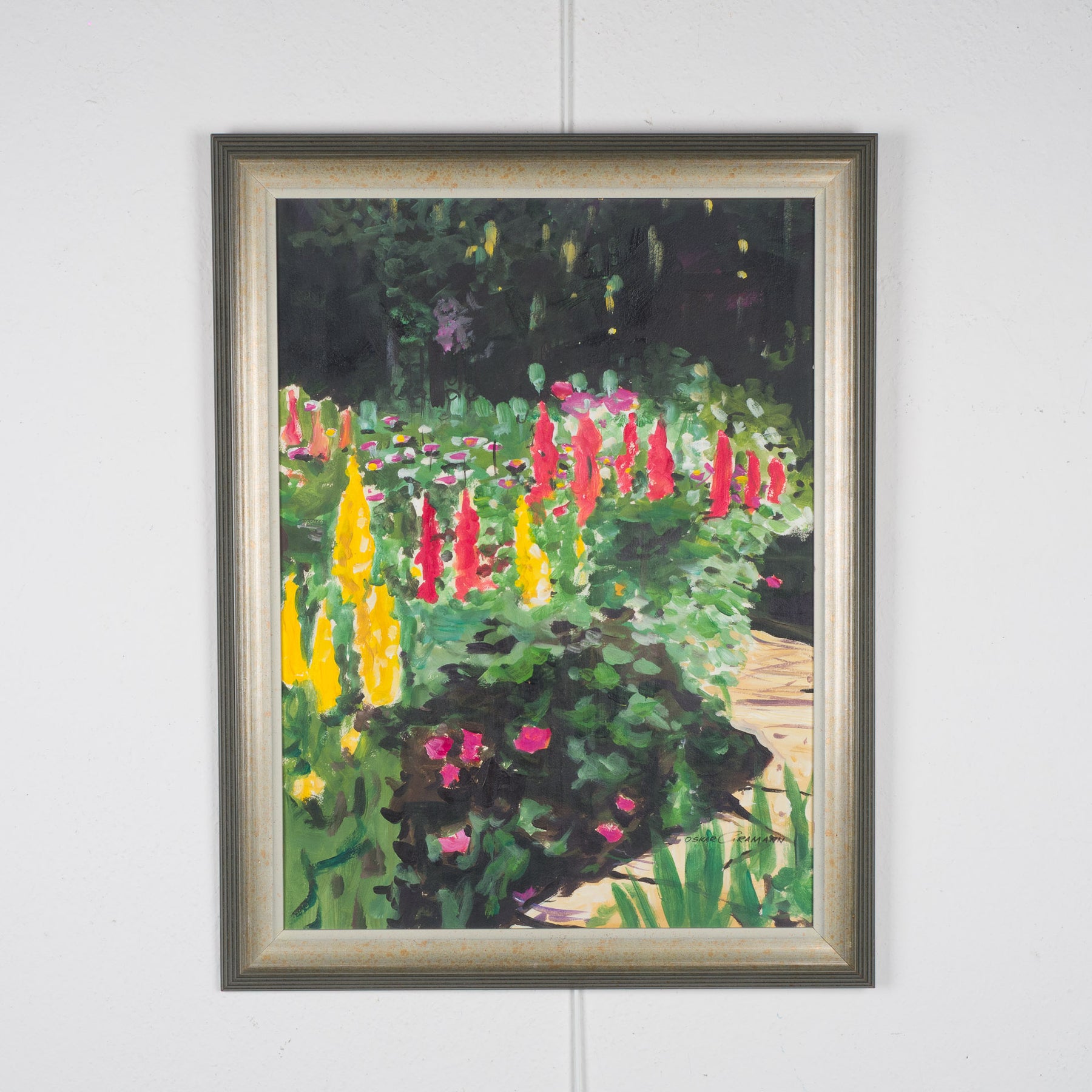 This piece is signed by the artist himself , offering an authentic glimpse into his creative world. The painting is subtly framed in a silver-plated wooden frame that elegantly frames the rich colors and delicate brushwork, enhancing its visual impact in your living space.