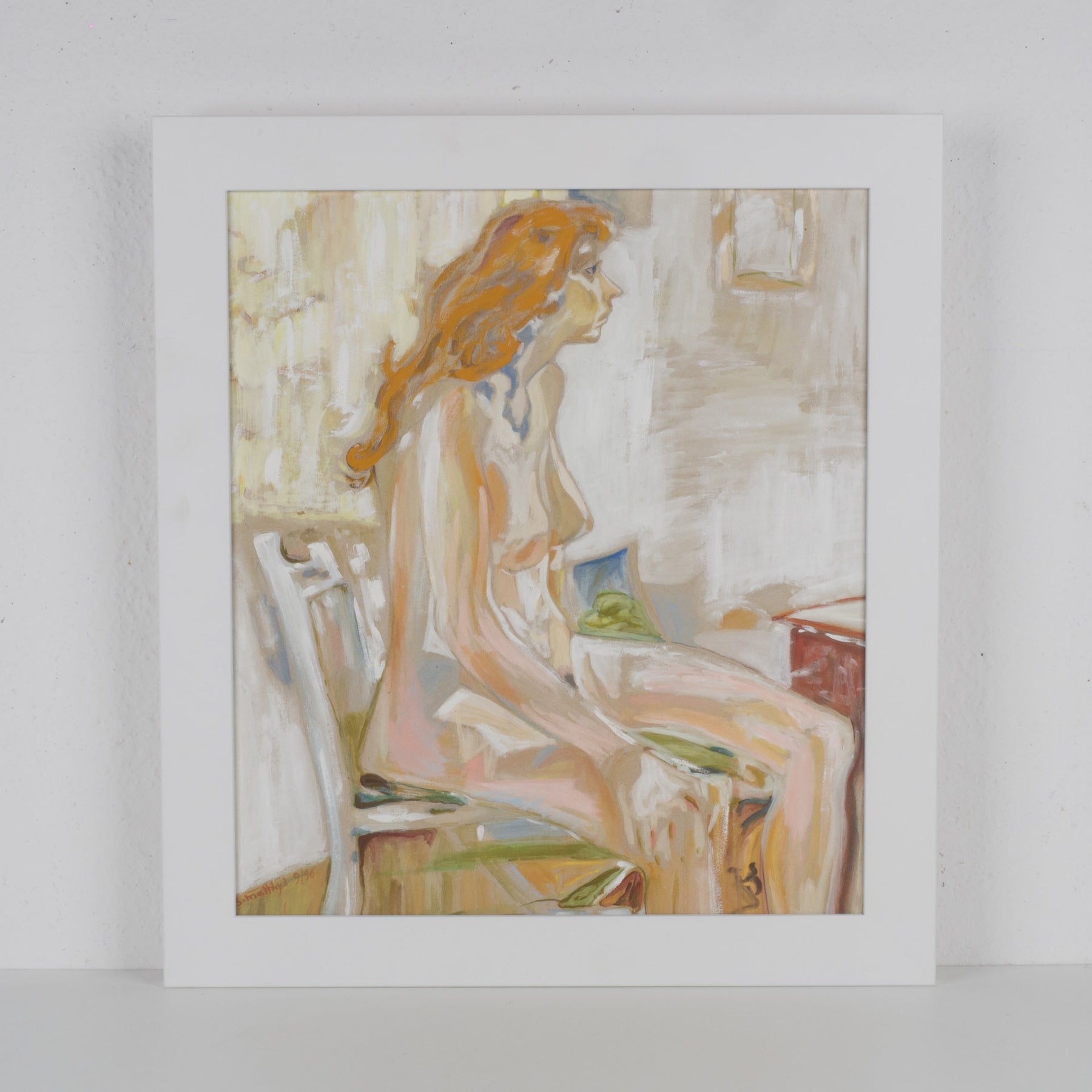 Bring timeless softness and artistic elegance to your interior with this atmospheric 1990s painting by S. Matthijs , which depicts a seated nude woman in beautiful pastel hues . The work exudes tranquility, intimacy, and a refined, almost impressionistic sensibility.