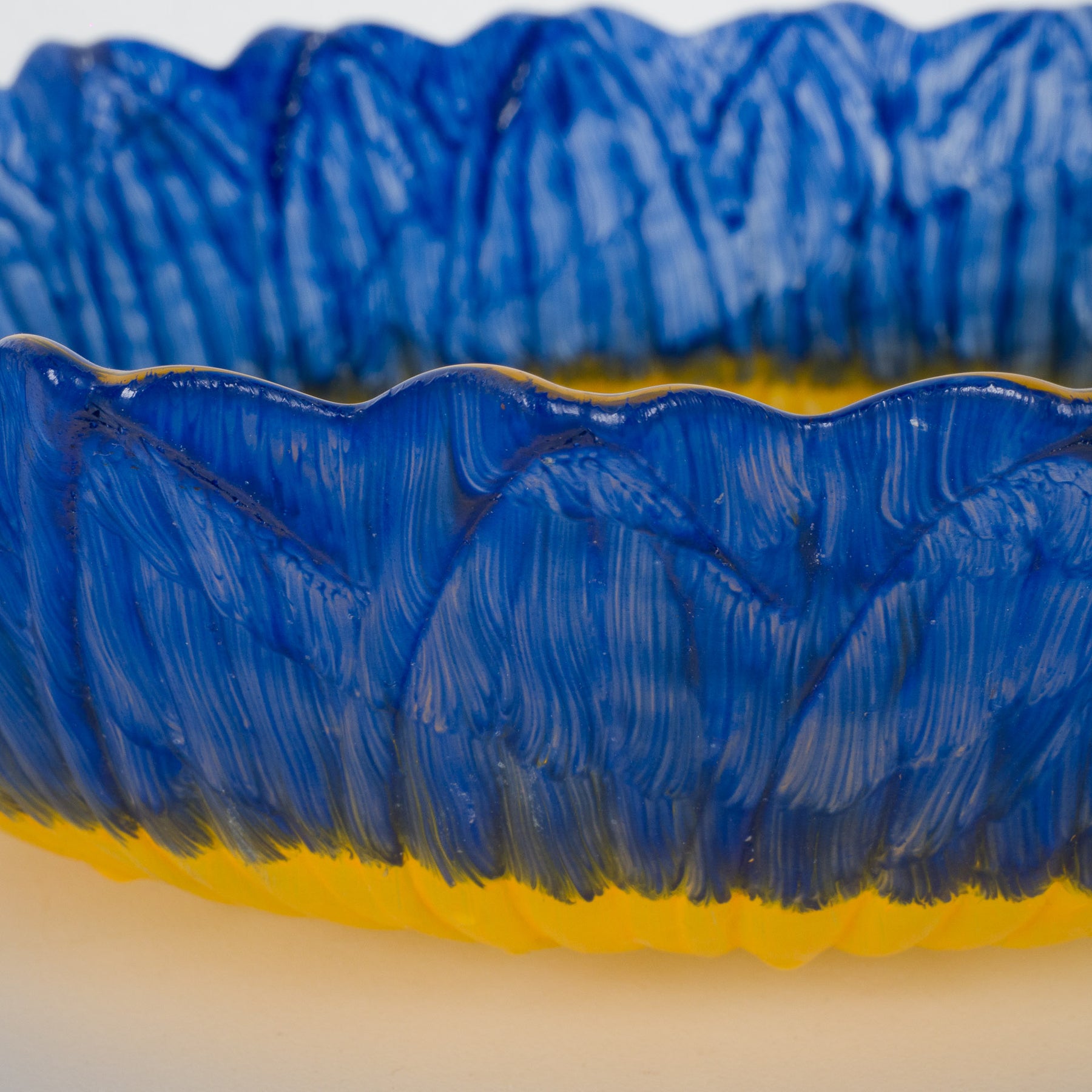 A beautiful hand-painted glass bowl in vibrant shades of yellow and blue. The playful, serrated edge gives this unique piece an expressive look. Measuring 26.5 x 26.5 x 6.5 cm, it's a real eye-catcher on a table, in a cabinet, or as an artistic accent in your interior.